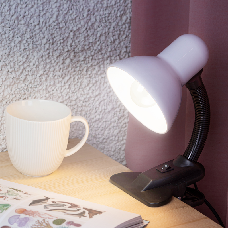 Настольный светильник-прищепка ЭРА N-212-E27-40W-W может использоваться с лампой накаливания, компактной люминесцентной лампой (КЛЛ) или светодиодной (LED) лампой.