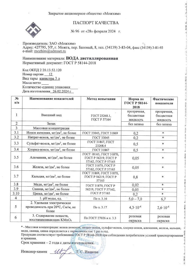 Вода дистиллированная 3л канистра Можхим *6/300