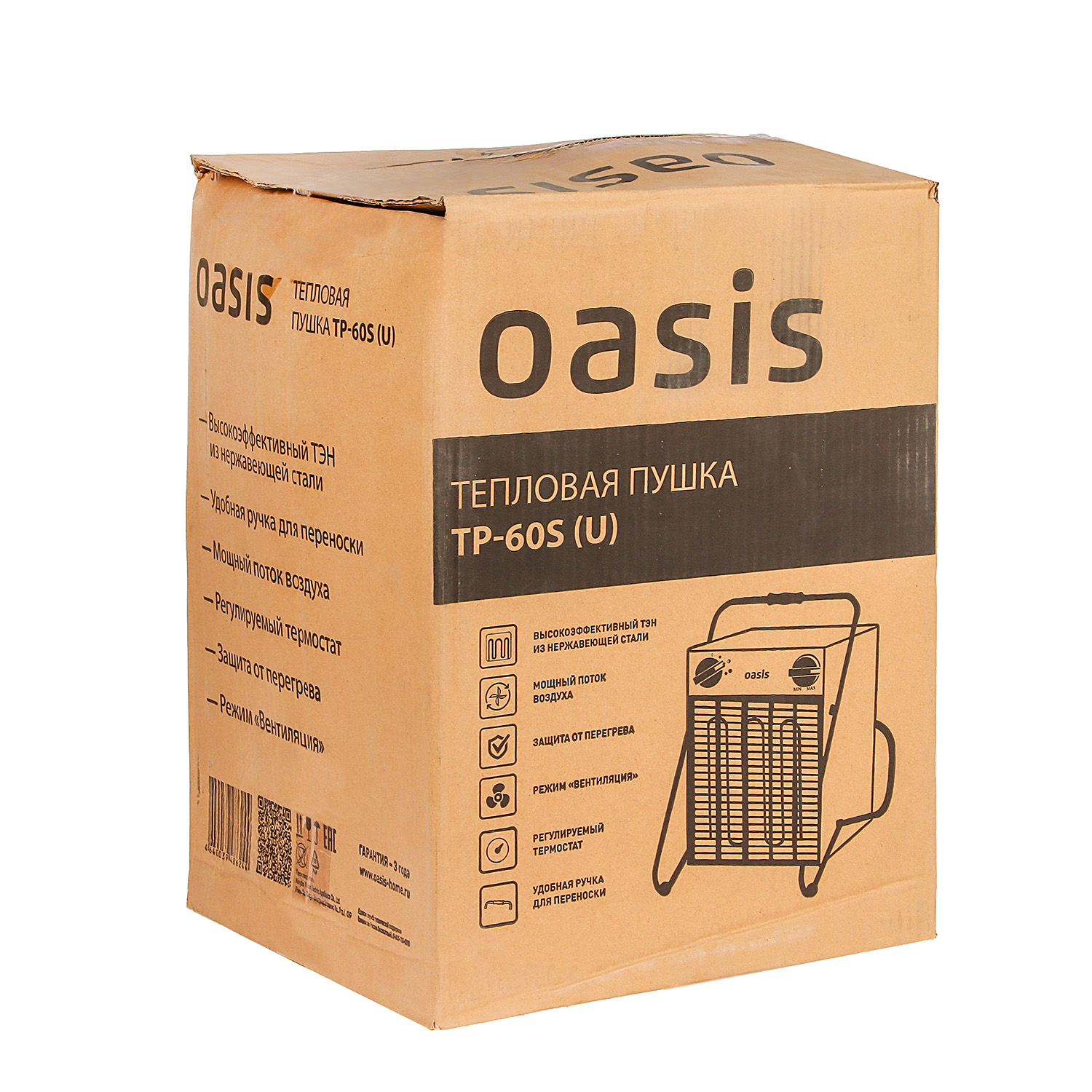 Тепловая пушка OASIS TP-60S (U) предназначена для больших помещений, используется в качестве основного источника тепла. Внутри корпуса размещен нагревательный элемент. Прибор обеспечивает мощный воздушный поток.