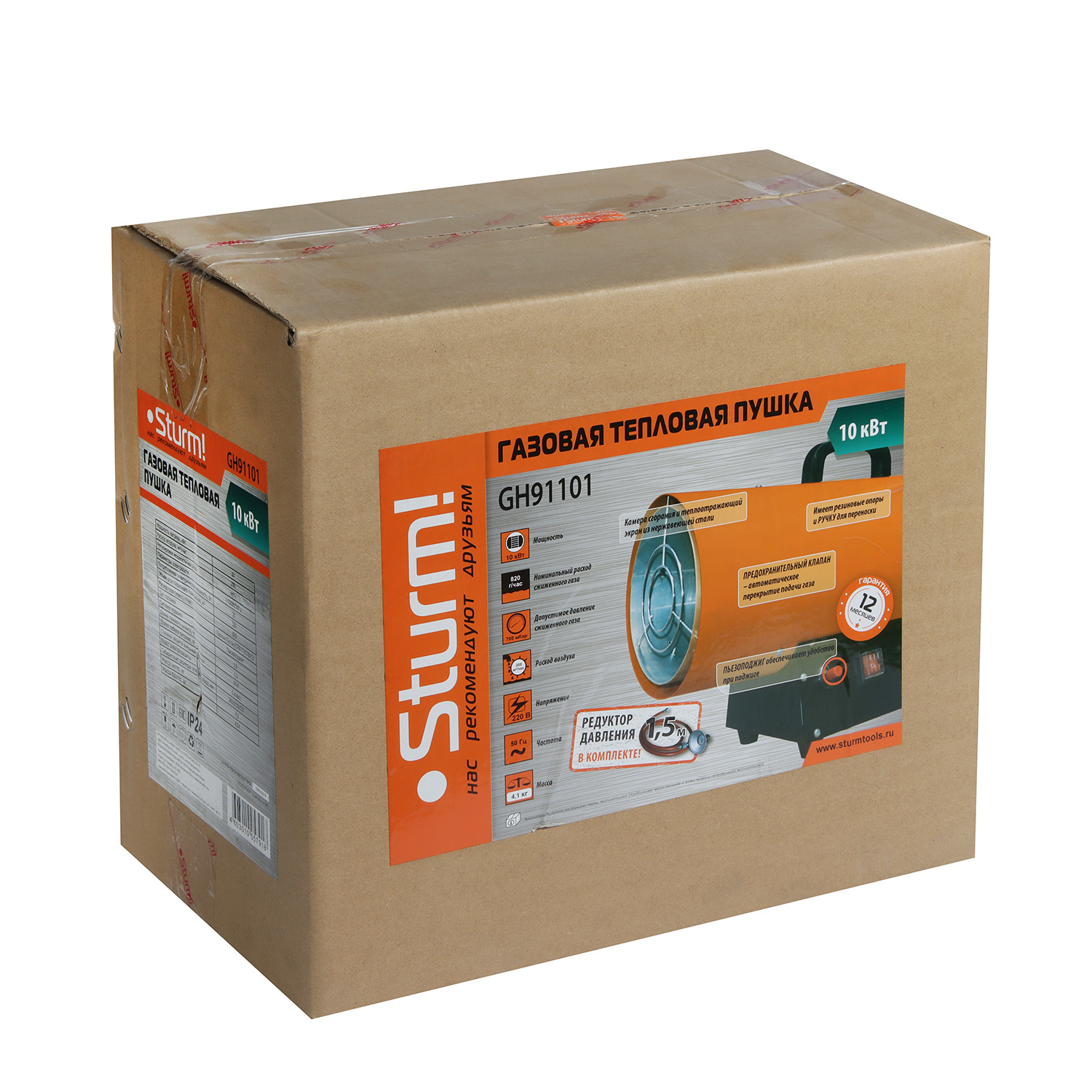Газовые тепловые пушки Sturm! - это высококачесвтенные устройства, которые способны в короткие сроки нагревать помещение любых размеров, а так же производить сушку помещения. Газовую пушку можно применять как для жилых помещений, так и для обогрева производственных мощностей. Газовая тепловая пушка Sturm! GH91101 мощностью в 10 кВт может обогревать помещение в новом доме площадью до 120 кв. м. или теплицу до 70 м2.