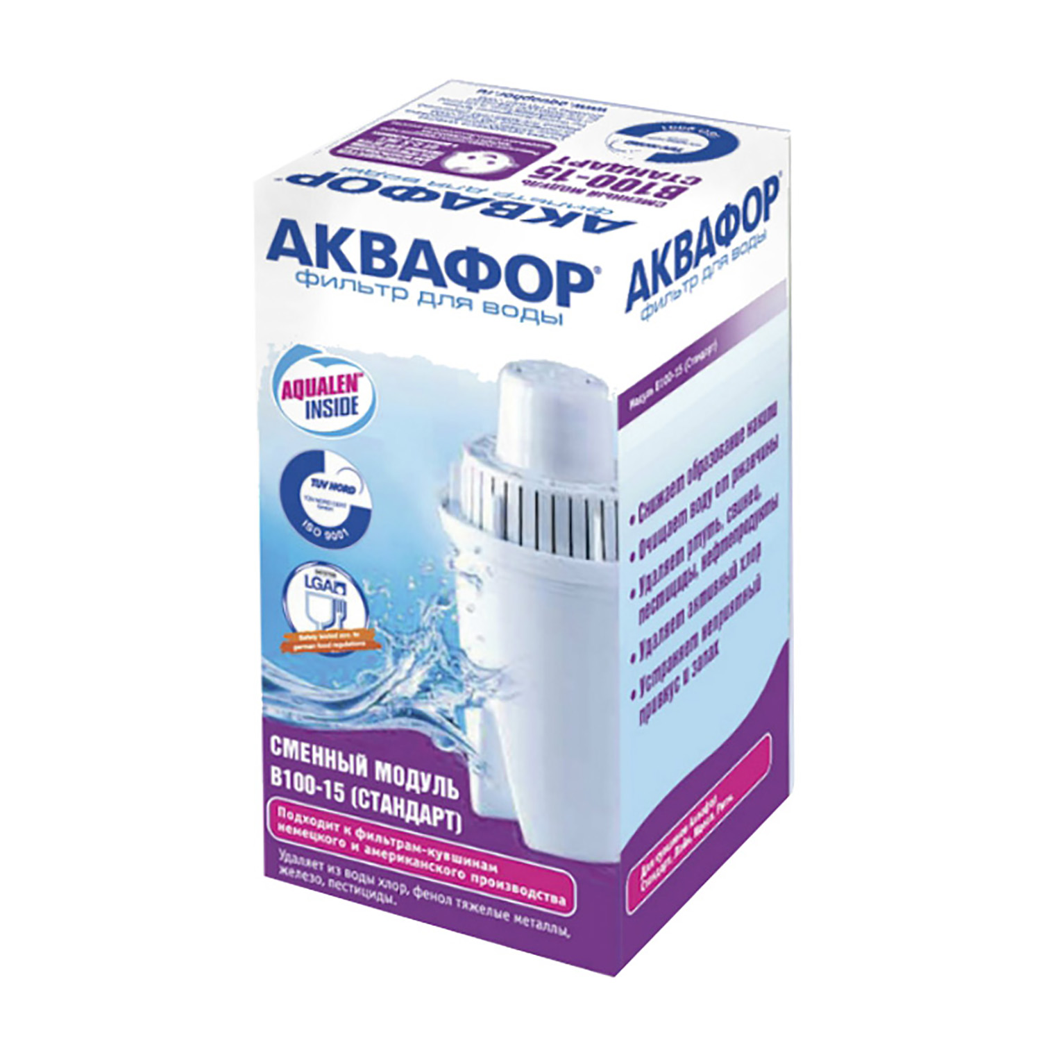 Модуль В100-15 содержит в оптимальном соотношении гранулы кокосового угля, ионообменные смолы и "ноу-хау" АКВАФОР - волокна Аквален, которые, подобно корням в почве, пронизывают картридж и фиксируют содержащиеся в нём фильтрующие элементы. В результате такой поддержки создаётся особая пространственная структура, благодаря которой фильтр работает быстрее и эффективнее. Благодаря Аквалену, модуль В100-15 очищает воду всем объемом, без застойных зон и канальных эффектов. Проходящая через модуль вода, тщательно очищается от хлора, тяжёлых металлов, органических веществ и многих других загрязнителей. Вода, очищенная модулем Аквафор "В 100-15", подходит для приготовления питания детям от 2-х лет.