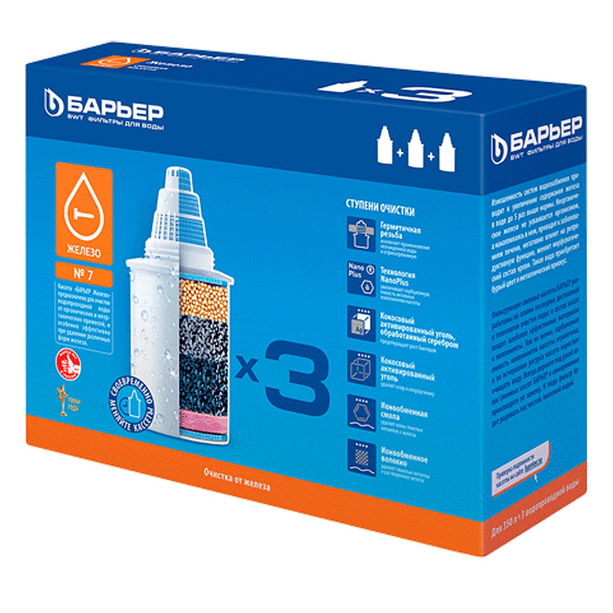 Комплект состоит из 3х сменных кассет. Подходят для всех кувшинов БАРЬЕР.