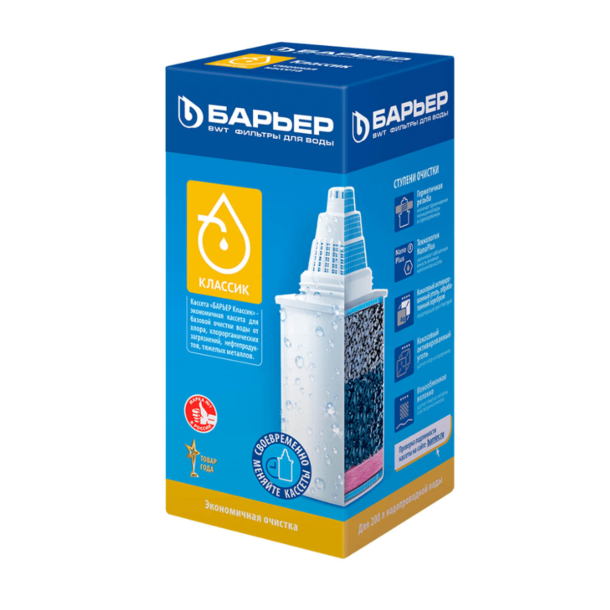 Сменная кассета «Классик» — экономичный фильтр базовой очистки воды от хлора, хлорорганических загрязнений, нефтепродуктов и тяжёлых металлов. Картридж подходит для любых фильтров-кувшинов «Барьер». Герметичная резьба исключает проникновение неочищенной воды в отфильтрованную.