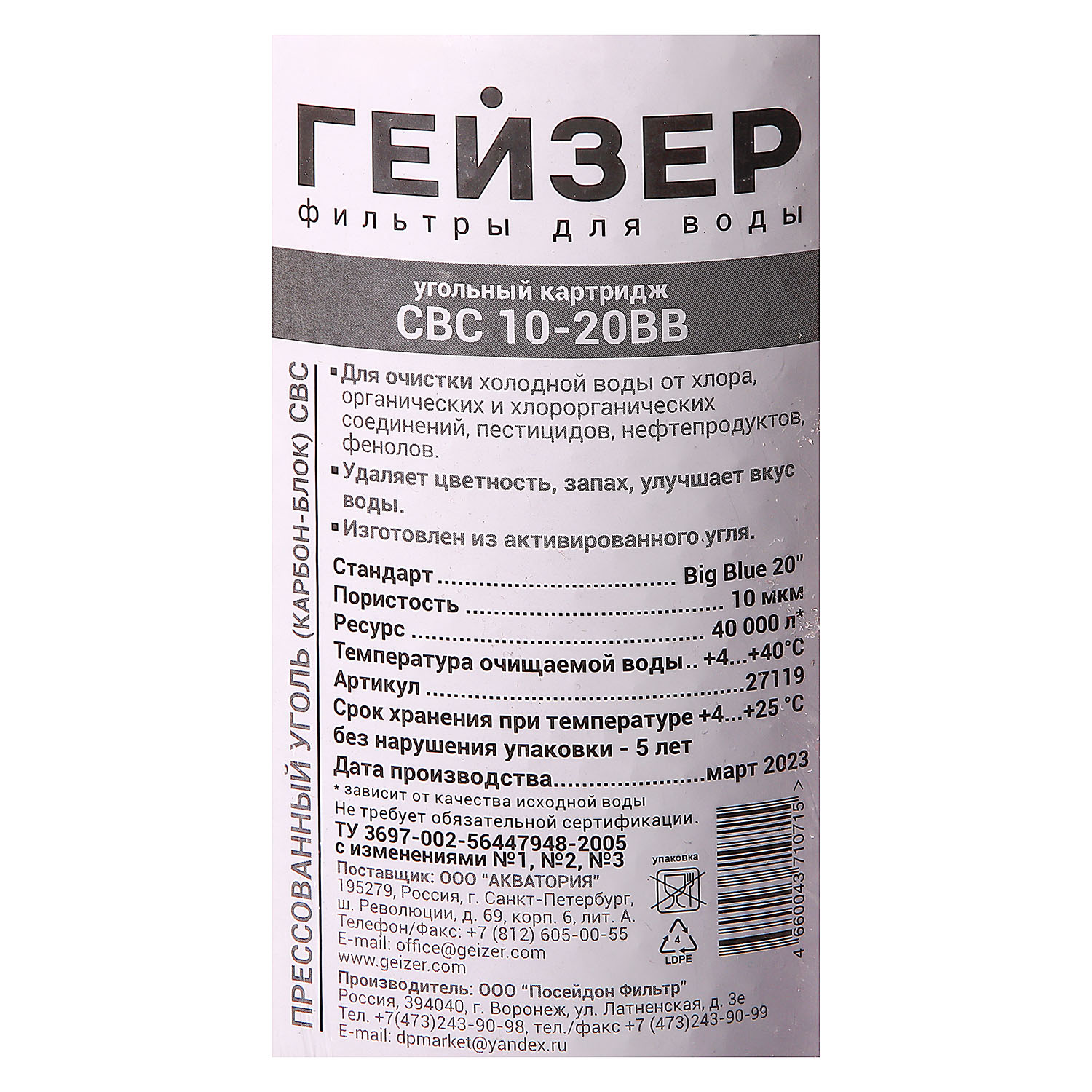Картридж CBC 10–20ВВ (РФ) изготовлен из активированного угля по технологии карбон-блок, что обеспечивает эффективную и глубокую очистку воды от хлора, органических и хлорорганических соединений. Он удаляет неприятные запахи, улучшая цвет и вкус воды. Серебро в структуре модуля препятствует размножению микроорганизмов внутри элемента.Сертифицирован американской ассоциацией NSF.