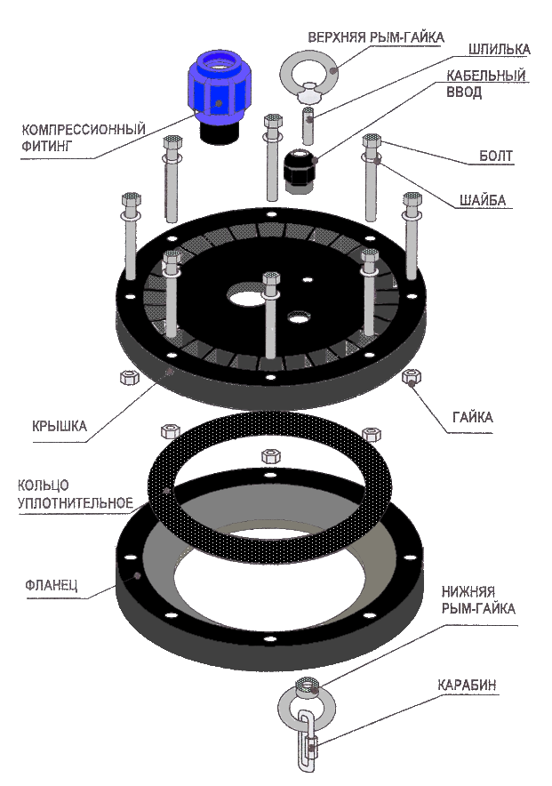 кважинный оголовок применяют для крепления насоса (насос должен висеть на трубе, трос - страховка) и герметизации устья обсадной трубы с целью предотвращения предотвратить попадание в скважину посторонних предметов и поверхностных грунтовых вод. А также существенно упрощает монтаж, демонтаж и техническое обслуживание насоса.