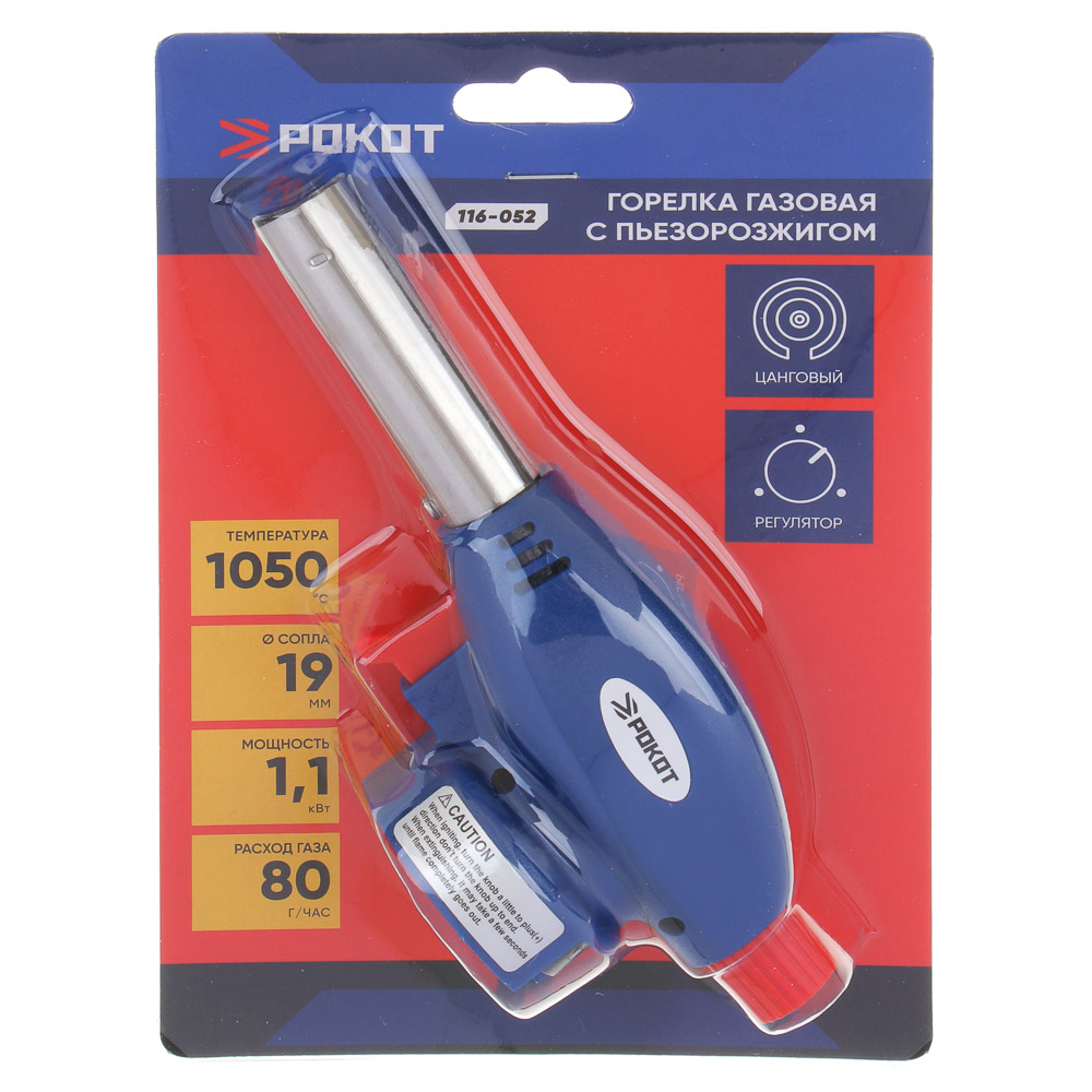 Газовая горелка с пьезорозжигом РОКОТ с цанговым захватом пригодится в хозяйстве, а также в туристических походах, на даче и даже в кулинарии. Имеет компактный размер с соплом 19 мм. Используется в качестве насадки на газовый баллон с соответствующим типом крепления. Расход газа – 80 г/час. Предусмотрен регулятор величины пламени. Надежная конструкция устойчива к поломкам. Мощность - 1,1 кВт. Температура пламени – 1050 градусов Цельсия.