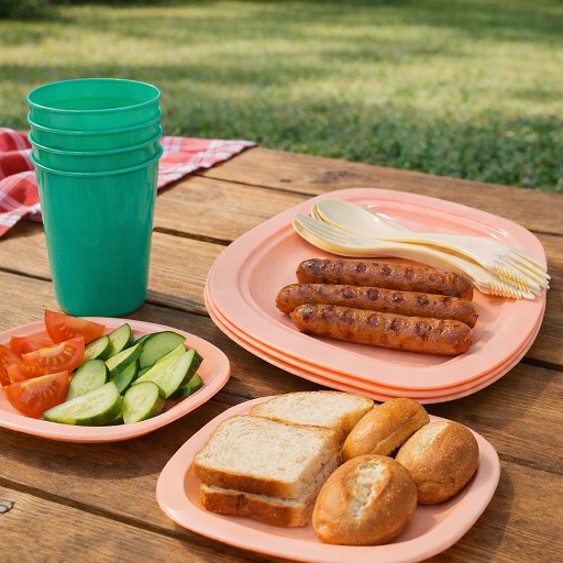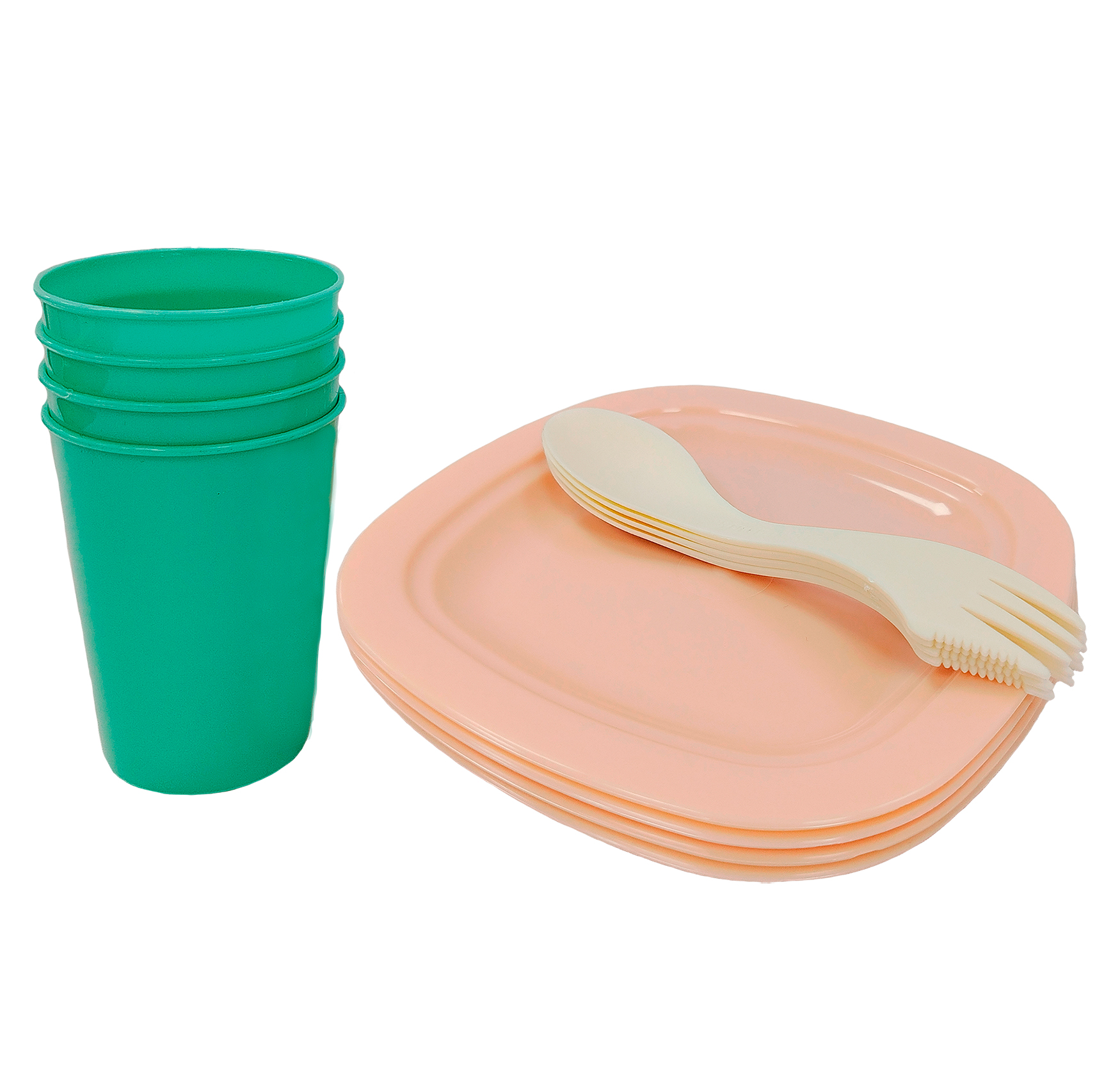 Набор пластиковой посуды на 4 персоны/ 12 предметов (Тарелка СМАК (d-18 см - 4шт, Стакан 350 мм - 4 ш, ложка-вилка-нож - 4 шт).