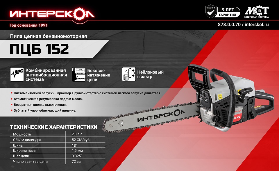 Цепная бензопила ИНТЕРСКОЛ ПЦБ 152 используется для пиления древесины при выполнении работ в приусадебном хозяйстве и частном домовладении, а также строительных, садовых и лесохозяйственных работ (распиловка дров, обрезка сучьев, заготовка лесоматериалов).