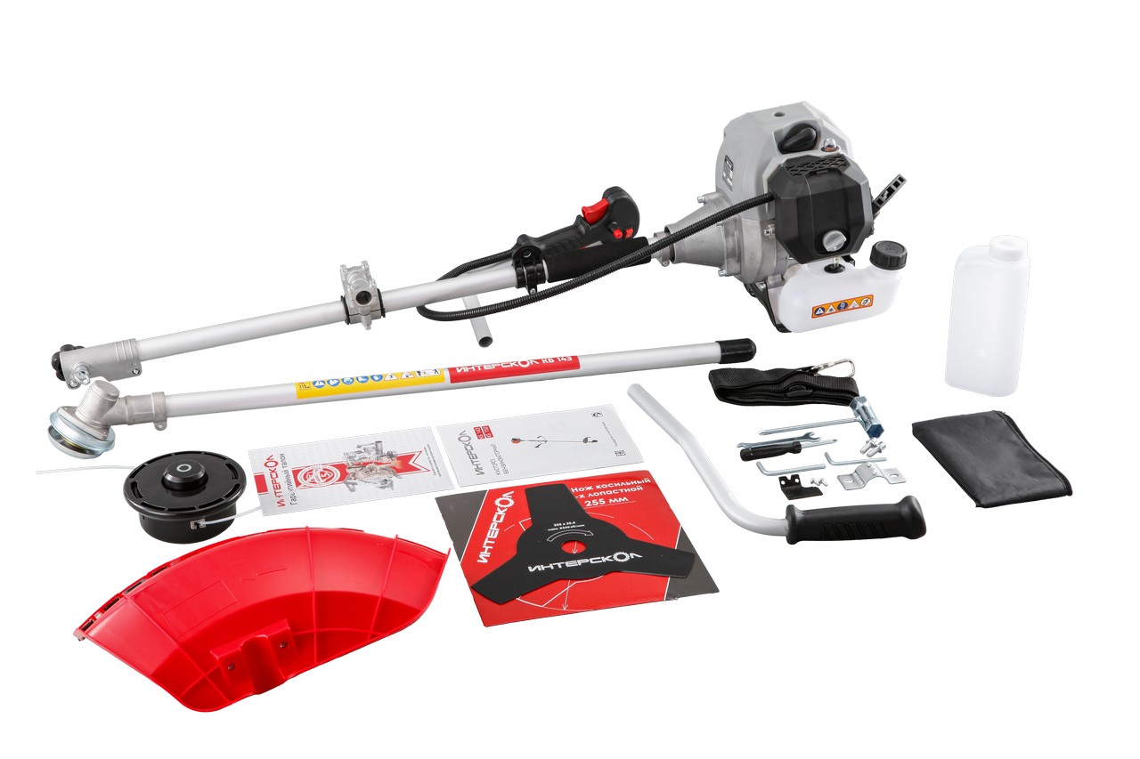 Комплектация: Кусторез бензиномоторный 1, Инструкция по безопасности и Руководство по эксплуатации 1, Гарантийный талон 1, Рукоятка двухсоставная велосипедного типа 1, Нож трёхлопастный 1, Комплект крепежа для ножа 1, Кожух защитный ножа 1, Комплект крепежа кожуха защитного 1, Головка режущая с леской 1, Ремень разгрузочный 1