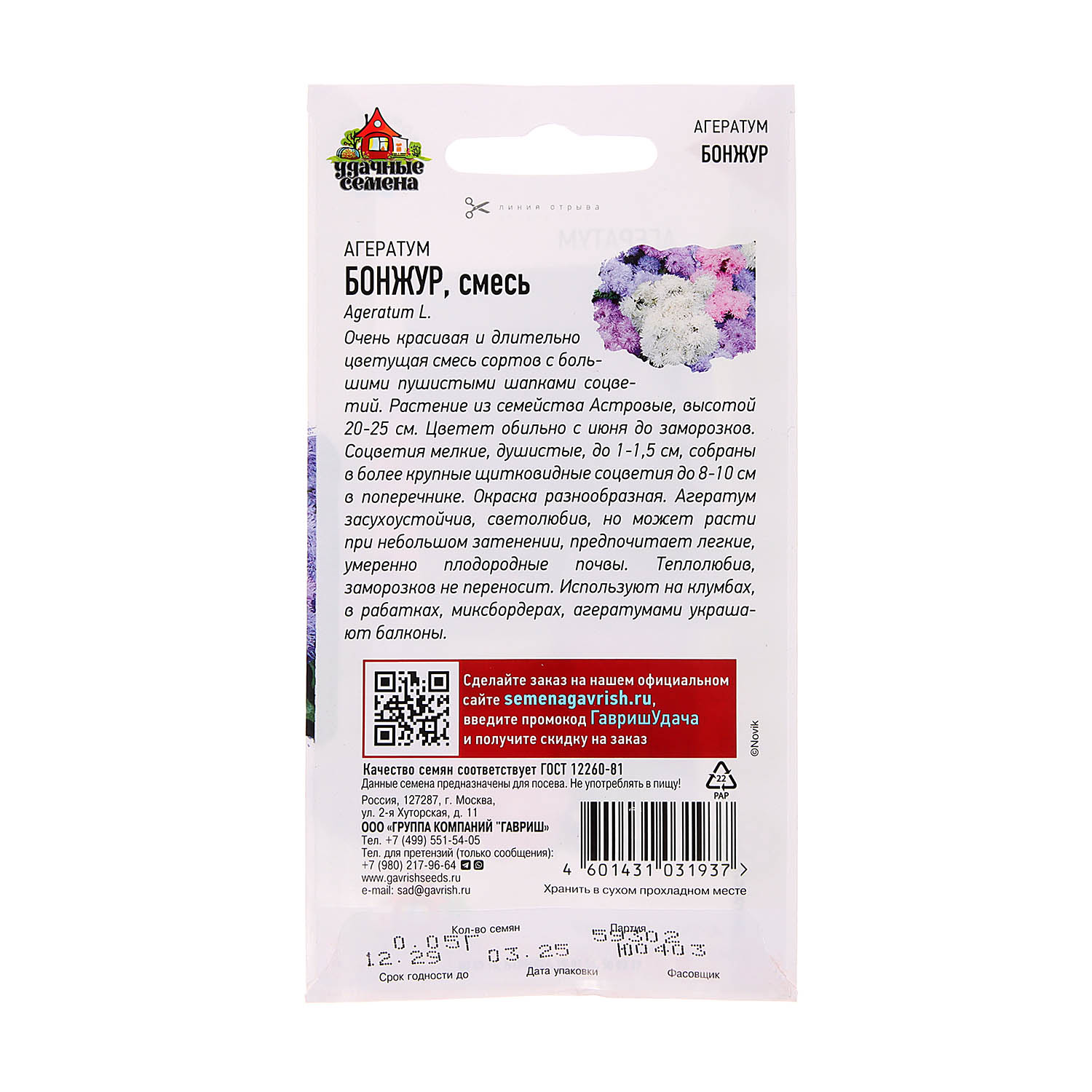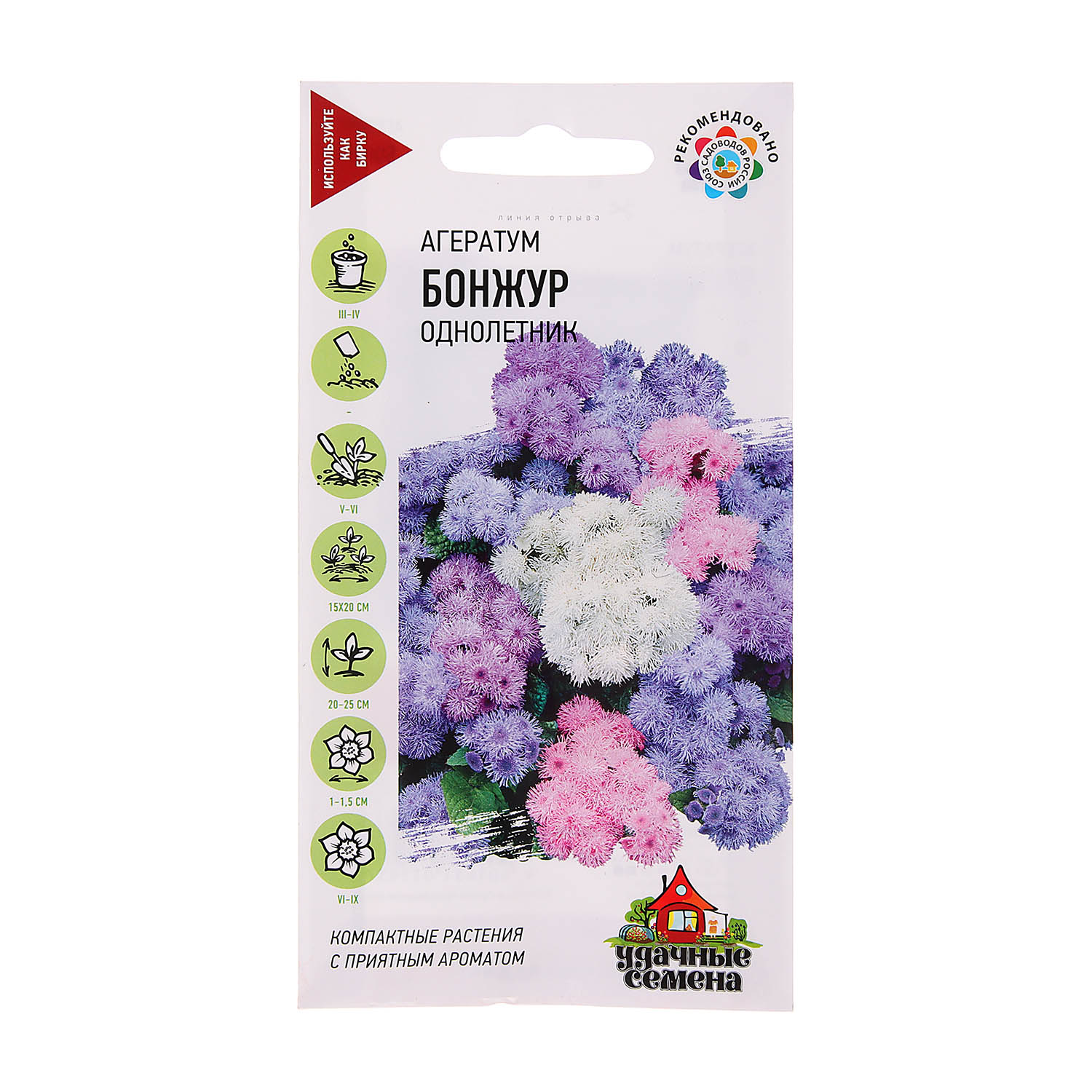 Очень красивая и длительно цветущая смесь сортов с большими пушистыми шапками соцветий. Растения из семейства Астровые, высотой 20-25 см. Цветение обильное с июня до заморозков. Соцветия мелкие, душистые, до 1-1,5 см, собраны в более крупные щитковидные соцветия до 8-10 см в поперечнике. Окраска разнообразная. Агератум засухоустойчив, светолюбив, но может расти при небольшом затенении, предпочитает легкие, умеренно плодородные почвы. Теплолюбив, заморозков не переносит. Используют на клумбах, в рабатках, миксбордерах, агератумами украшают балконы.