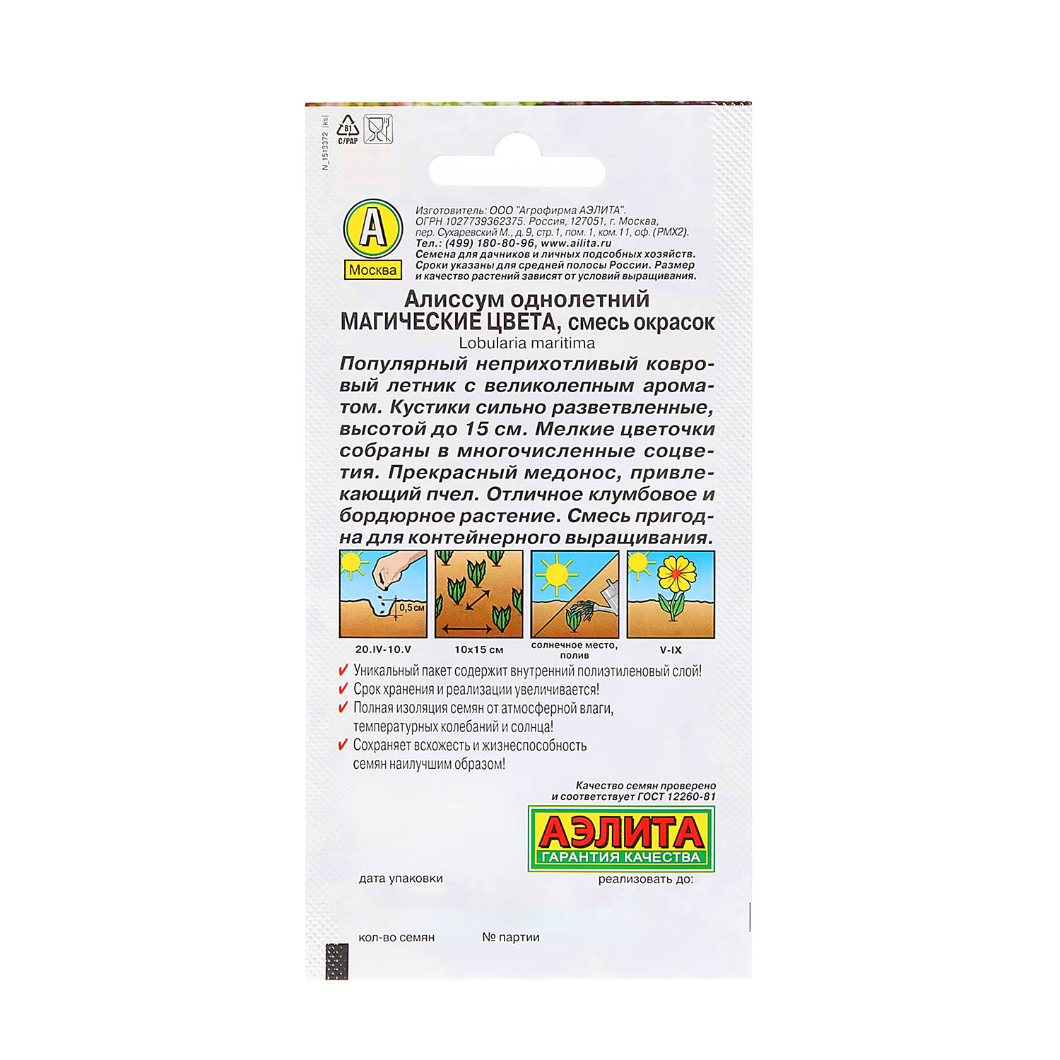 Неприхотливый ковровый летник с великолепным медовым ароматом. Холодостойкий. Формирует сильно разветвленные кустики 15 см высотой. Мелкие цветочки разнообразной окраски собраны в многочисленные кисти. Прекрасный медонос, привлекающий в сад много пчел. Отличное клумбовое и бордюрное растение для окаймления садовых дорожек и цветников. Пригоден для контейнерного выращивания.