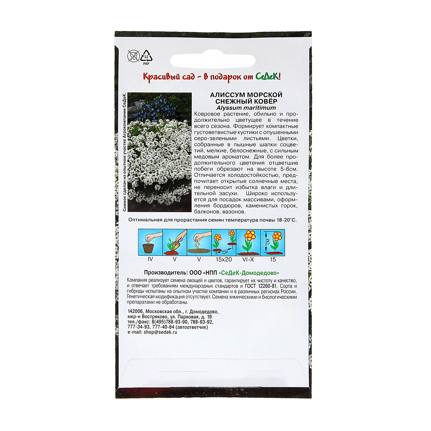 Ковровое растение, обильно и продолжительно цветущее в течение всего сезона. Формирует компактные густоветвистые кустики с опушенными серо-зелеными листьями. Цветки, собранные в пышные шапки соцветий, мелкие, белоснежные, с сильным медовым ароматом. Для более продолжительного цветения отцветшие побеги обрезают на высоте 5-6см. Отличается холодостойкостью, предпочитает открытые солнечные места, не переносит избытка влаги и длительной засухи. Широко используется для посадок массивами, оформления бордюров, каменистых горок, балконов, вазонов.