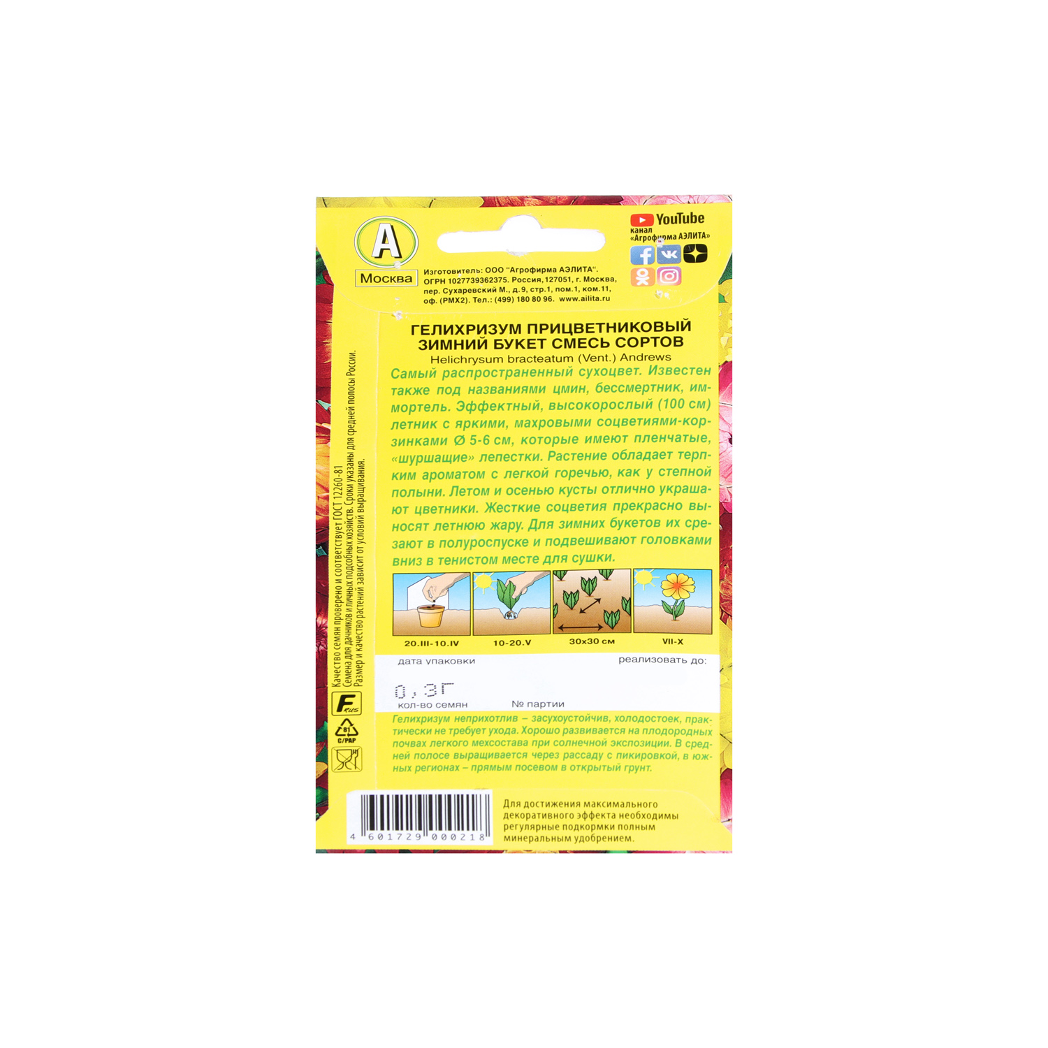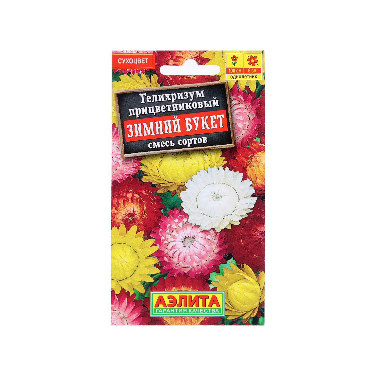 Самый распространенный сухоцвет. Известен также под названиями цмин, бессмертник, иммортель. Эффектный, высокорослый (100 см) летник с яркими, махровыми соцветиями-корзинками ? 5-6 см, которые имеют пленчатые, «шуршащие» лепестки. Растение обладает терпким ароматом с легкой горечью, как у степной полыни. Летом и осенью кусты отлично украшают цветники. Жесткие соцветия прекрасно выносят летнюю жару. Для зимних букетов их срезают в полуроспуске и подвешивают головками вниз в тенистом месте для сушки.