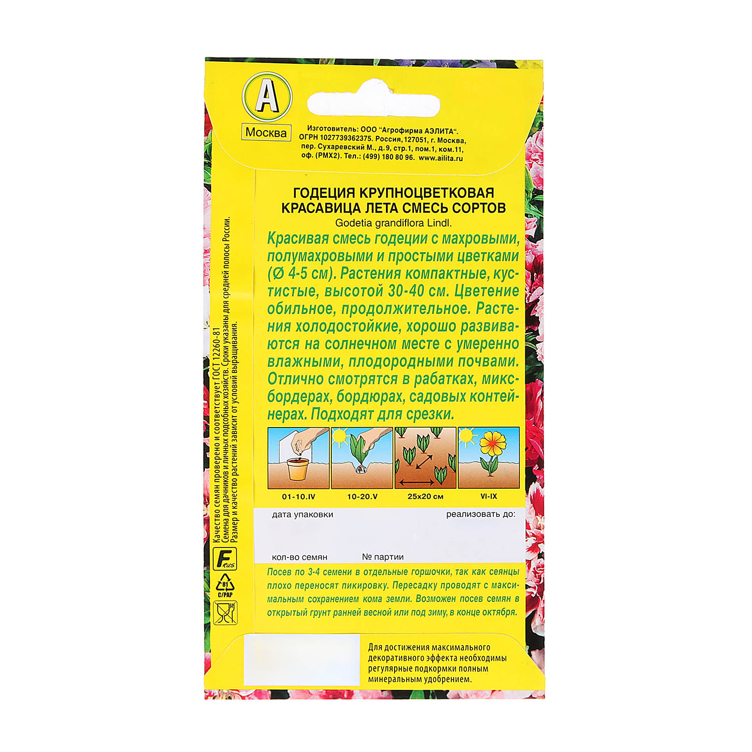 Посев семян на рассаду по 3-4 семени в отдельные горшочки, так как сеянцы плохо переносят пикировку. Рассаду в открытый грунт высаживают, не дожидаясь сроков окончания возвратных заморозков. Посадку проводят с максимальным сохранением кома земли. Возможен посев семян в открытый грунт ранней весной или под зиму, в конце октября.