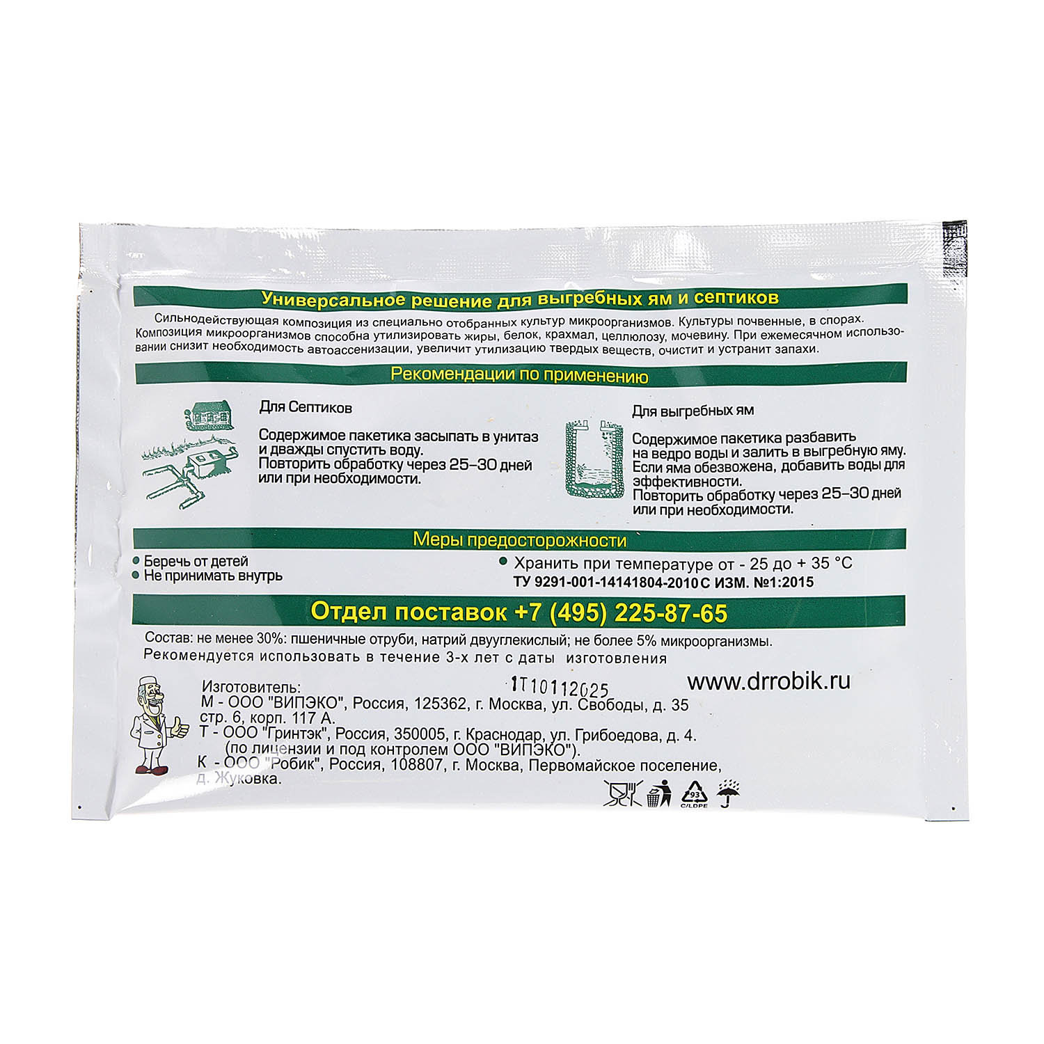 Культуры почвенные в спорах, входящие в состав Доктор Робик 109 способны в течение короткого времени утилизировать бумагу, фекалии, жиры, белки, целлюлозу, мочевину, крахмал.
