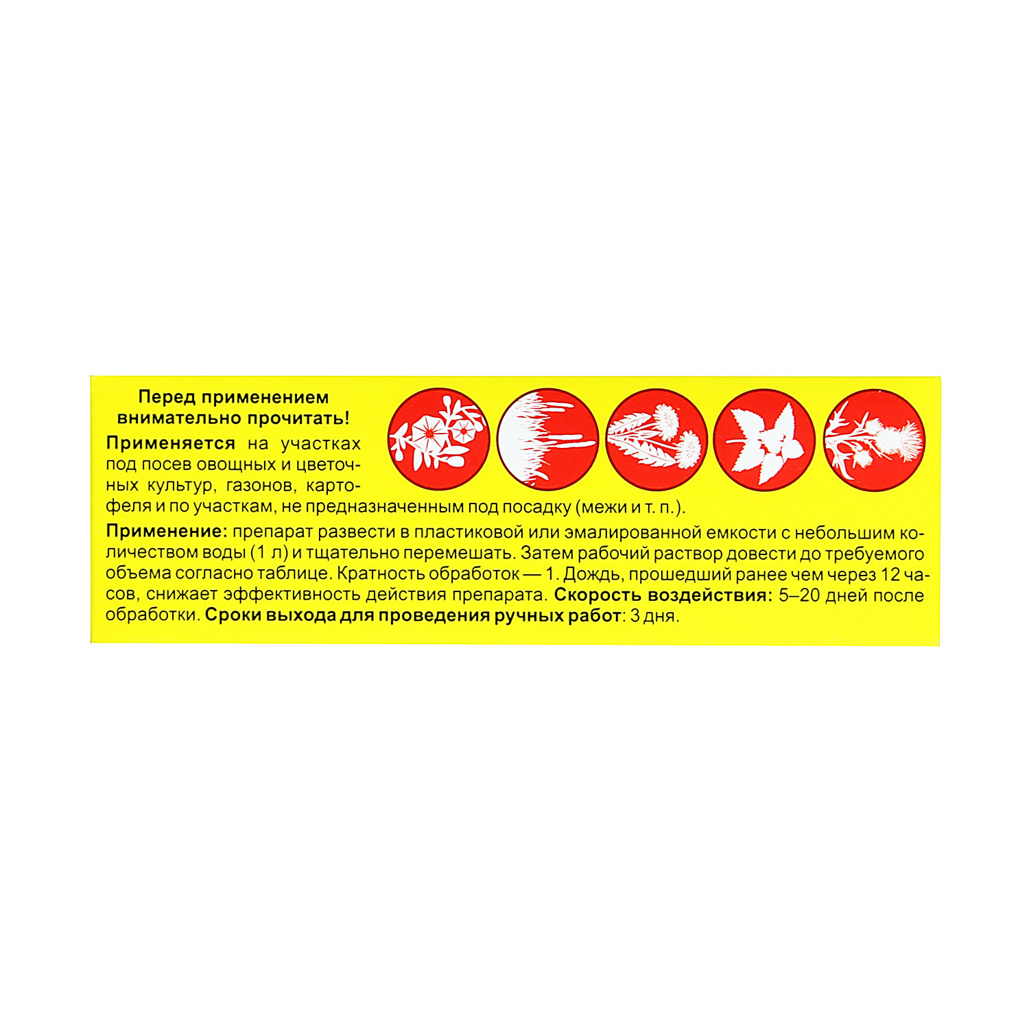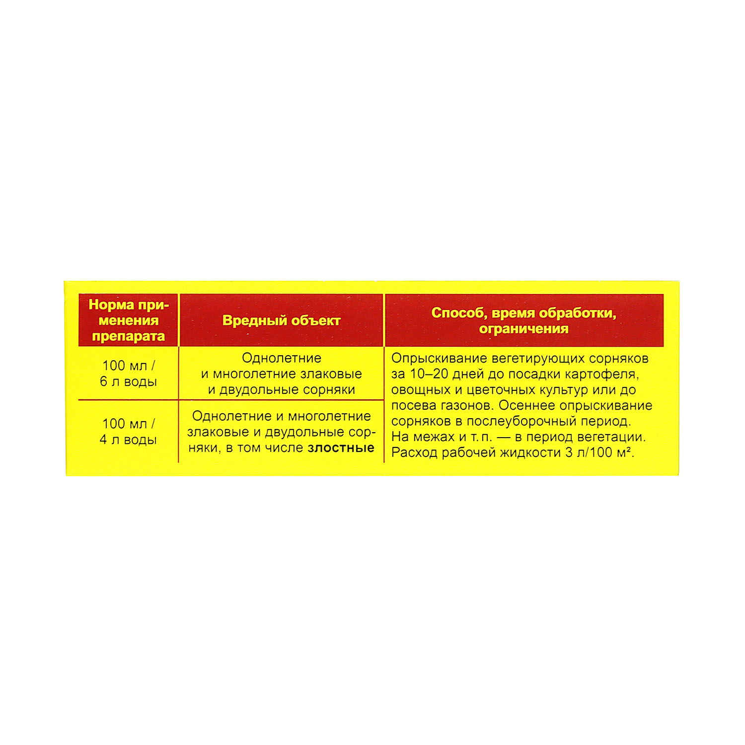 Однолетние и многолетние злаковые и двудольные сорняки Опрыскивание вегетирующих сорняков за 10–20 дней до посадки картофеля, овощных и цветочных культур или до посева газонов. Осеннее опрыскивание сорняков в послеуборочный период. На межах и т. п. — в период вегетации. Расход рабочей жидкости 3 л/100 м². 100 мл / 4 л воды
