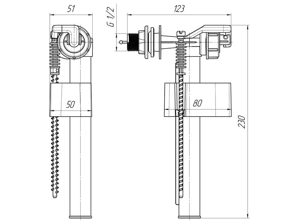 Наливной механизм бачка унитаза с боковой подводкой и пластиковой резьбой диаметром 1/2 эконом