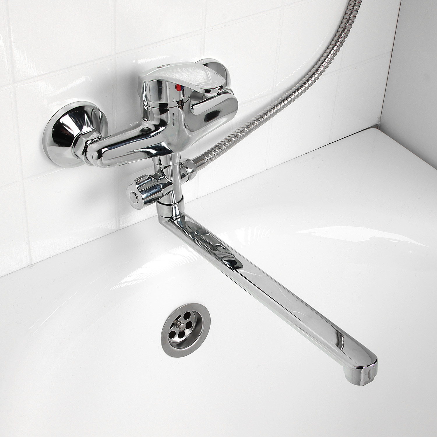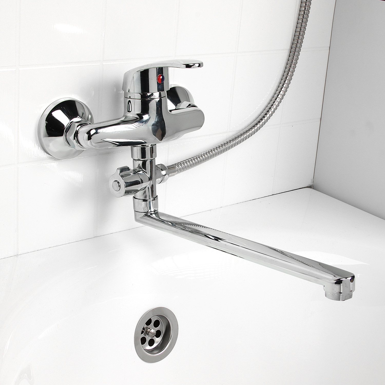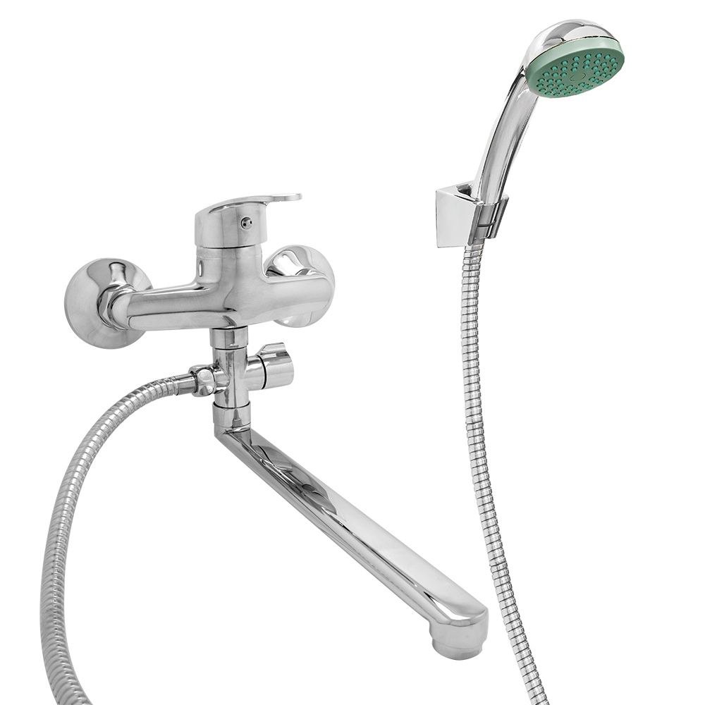 Однозахватный смеситель с пластиковой ручкой и картриджем 40 мм, наружным поворотным дивертором, поворотным плоским изливом 30 см, аэратором типа "Бенц", выпуклыми отражателями и душевым комплектом.