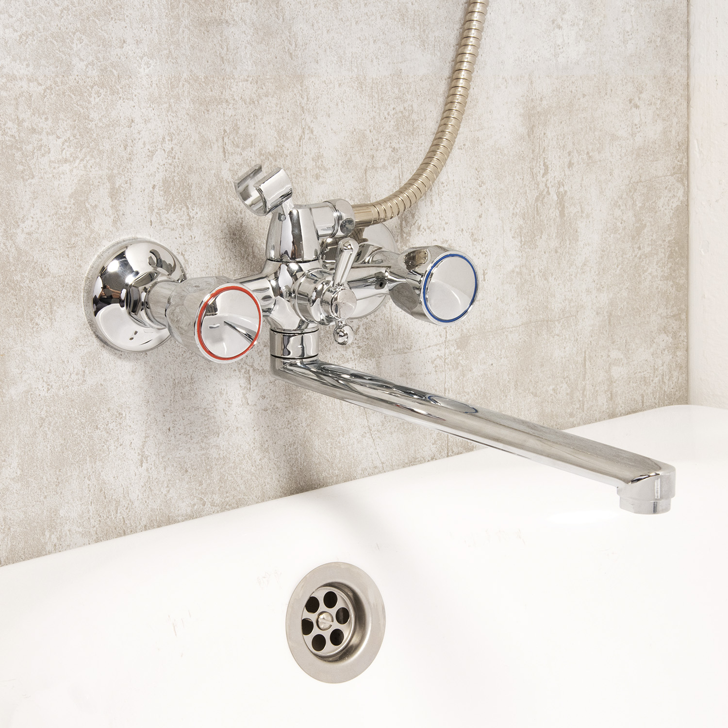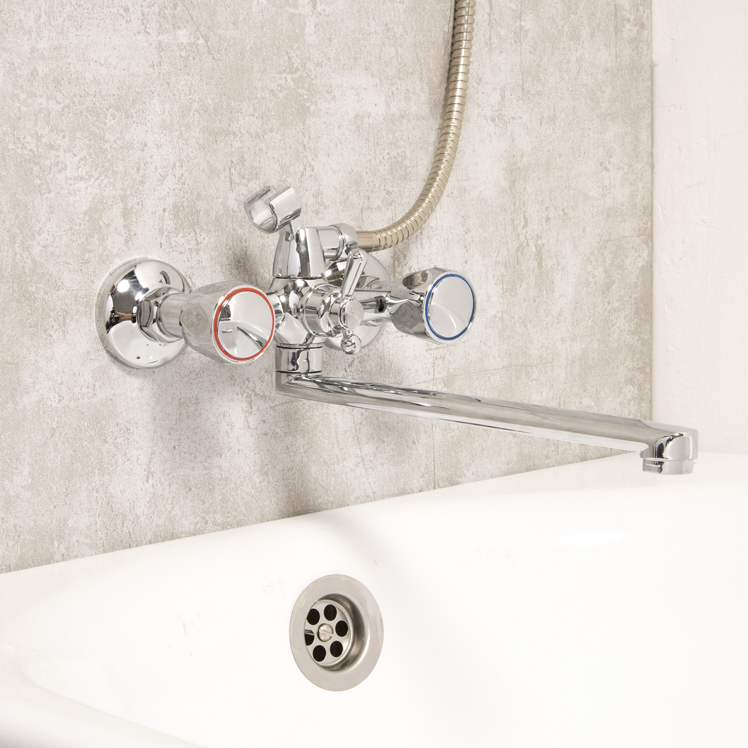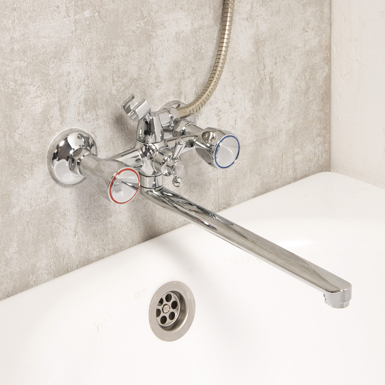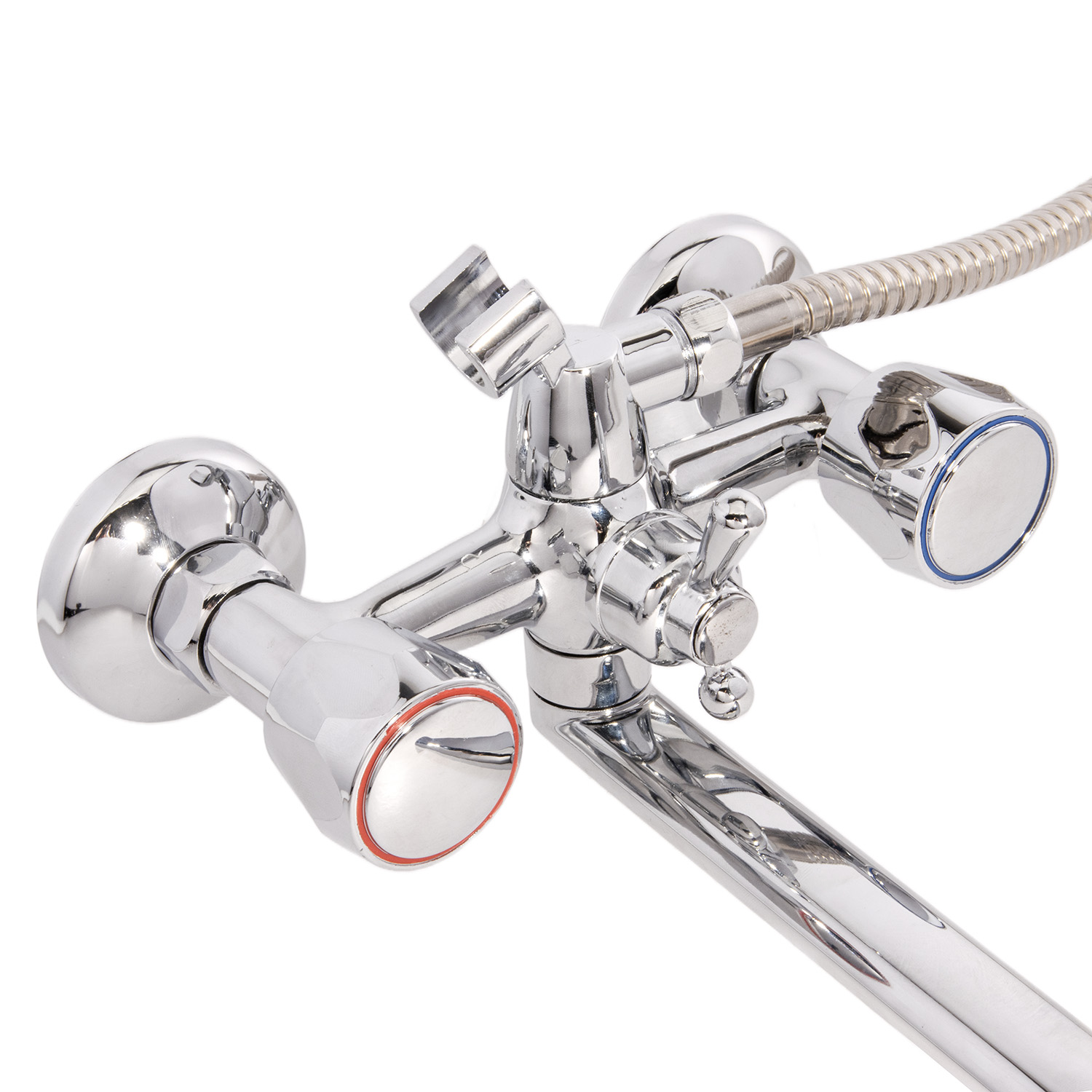 Двухзахватных смеситель с корпусом из цинкового сплава, округлыми пластиковыми маховиками, металлокерамическими латунными кран-буксами, выпуклыми отражателями, поворотным плоским изливом 30 см, аэратором типа "Бенц". Пластиковые маховики благодаря низкой теплопроводности гарантируют безопасность использования. Гарантия на корпус - 3 года.