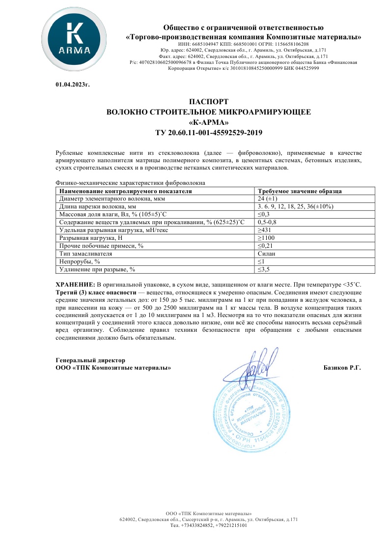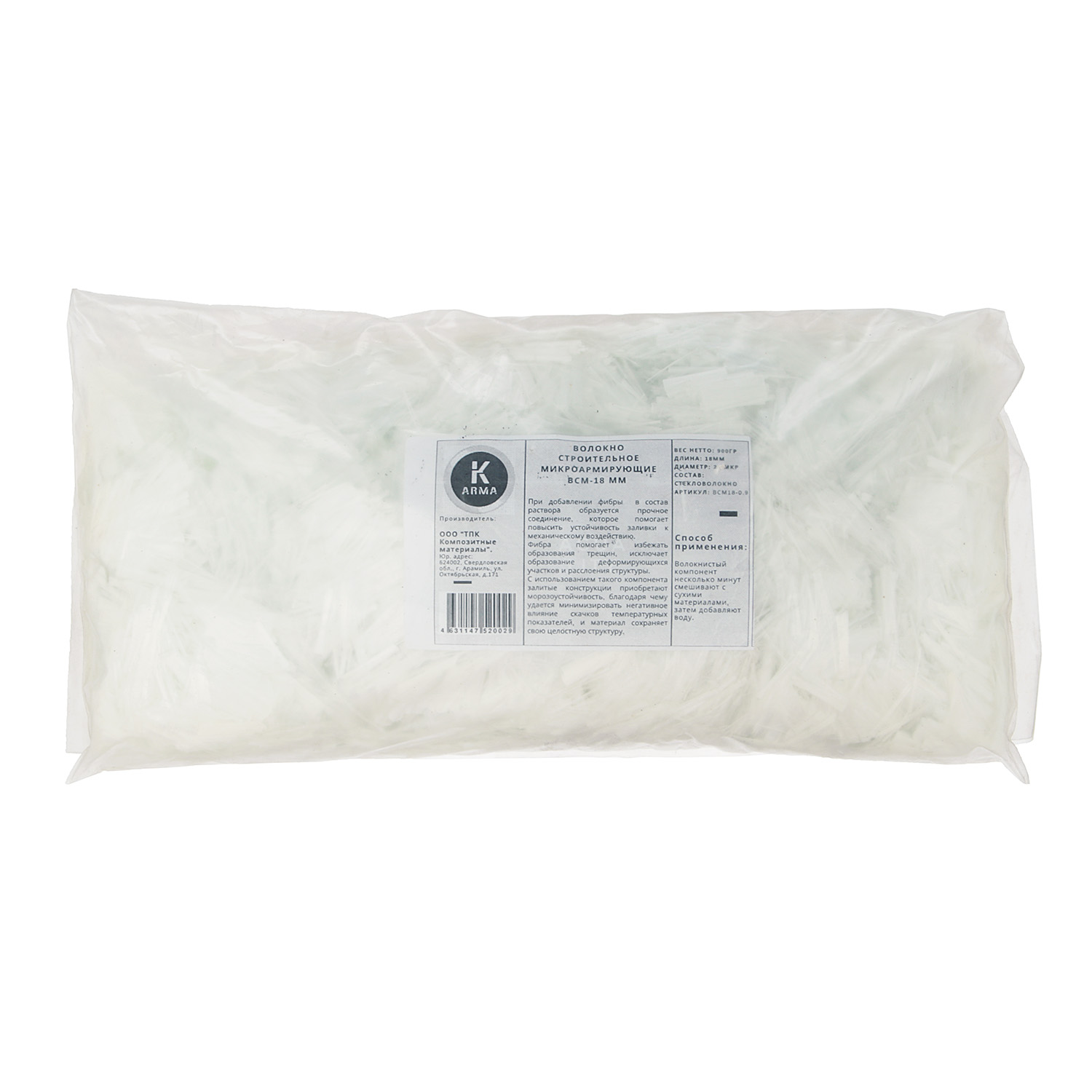 Волокна армирующие - фибра стеклянная 18мм 0,9кг ВСМ18-0.9 ("К-Арма") *20