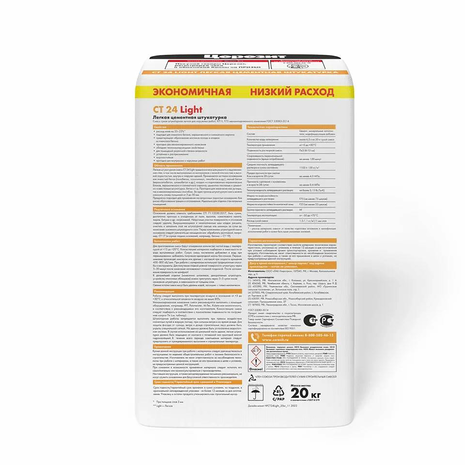 Легкая штукатурная смесь CT 24 Light предназначена для ремонта и выравнивания стен, в том числе выполненных из материалов с низкой плотностью и высокой пористостью, внутри и снаружи зданий.