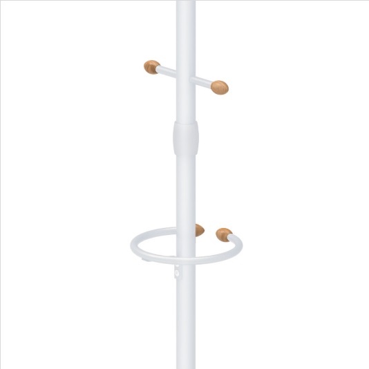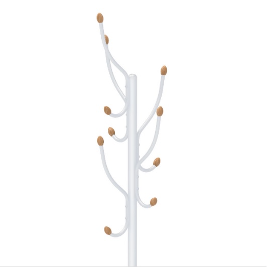 Напольная вешалка оригинальной формы с декором из дерева на круглом основании.