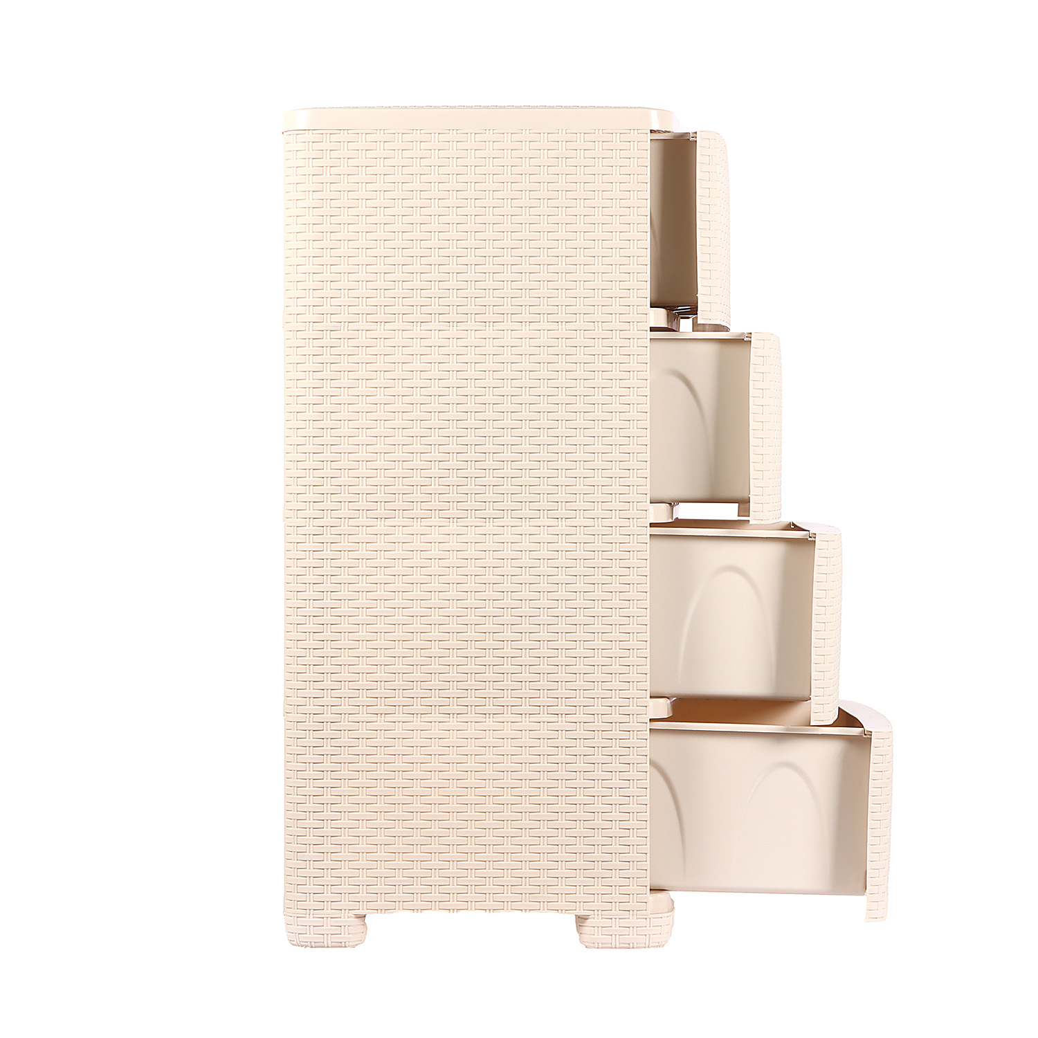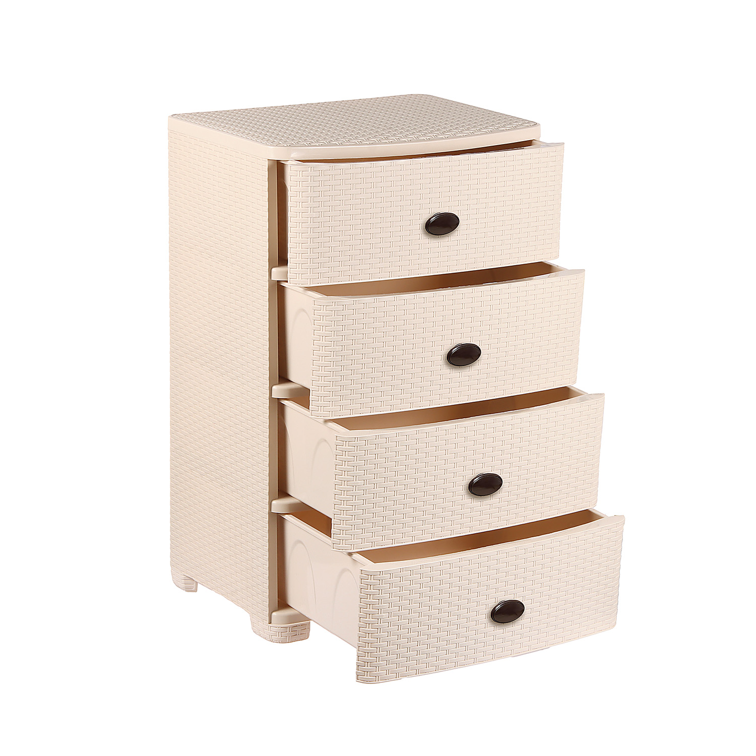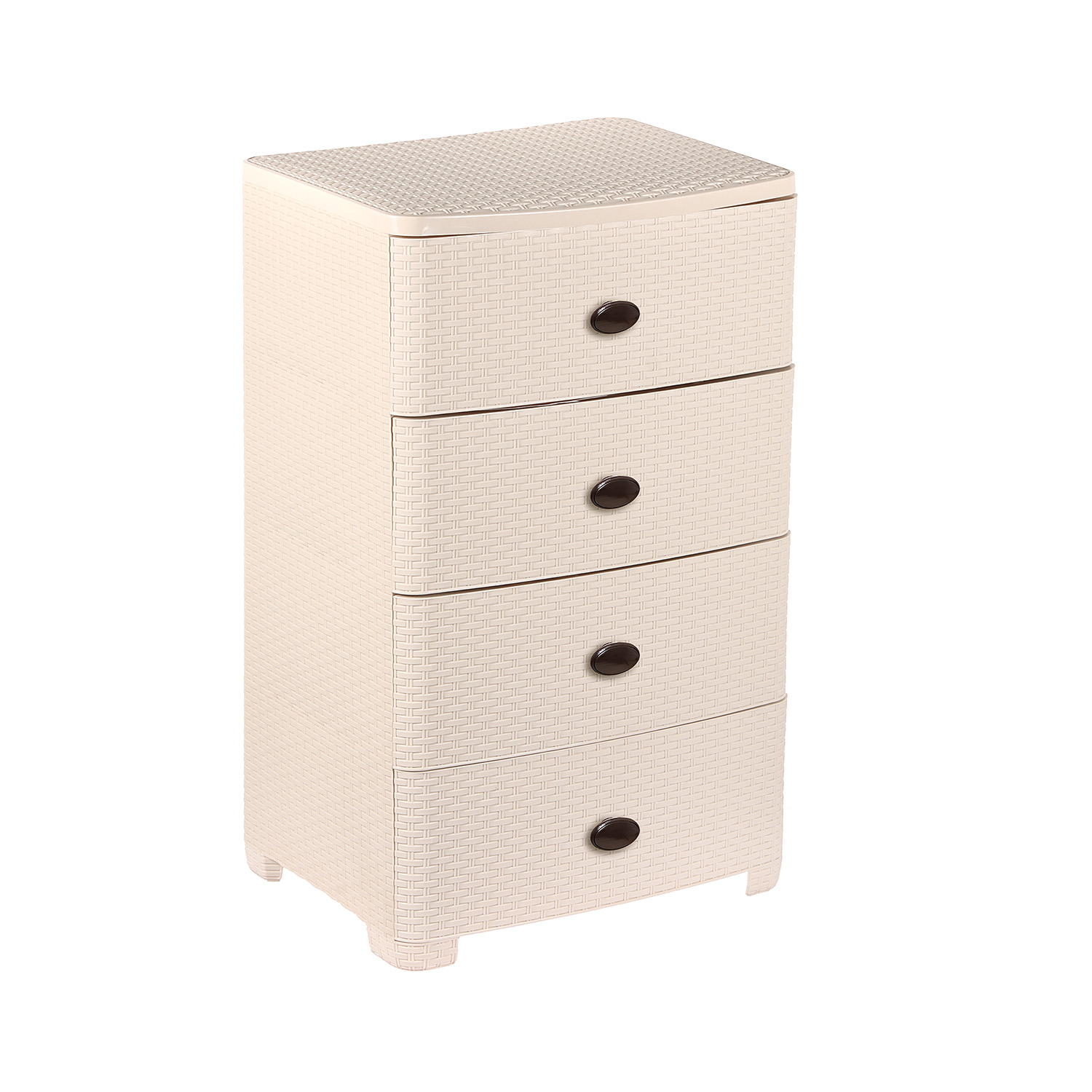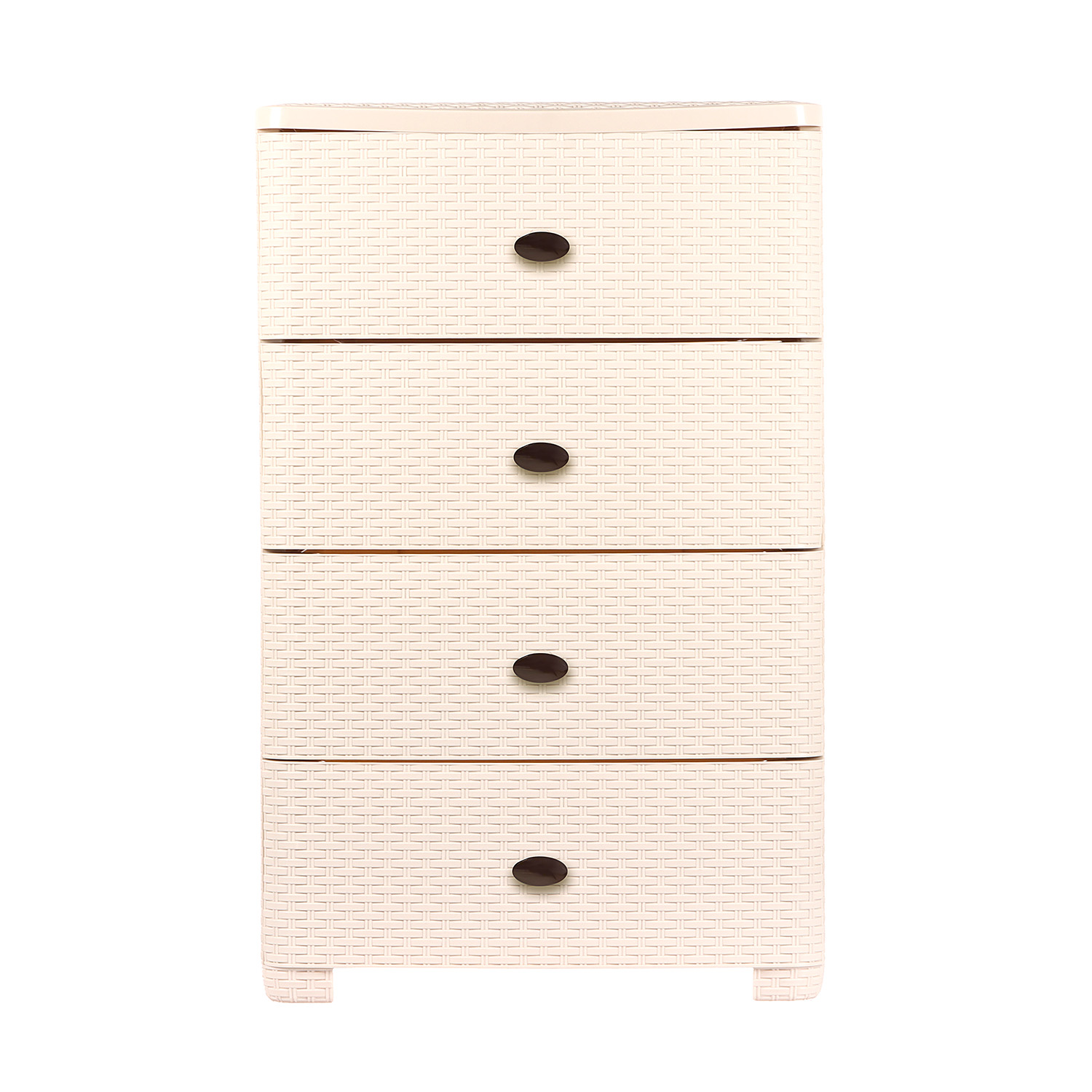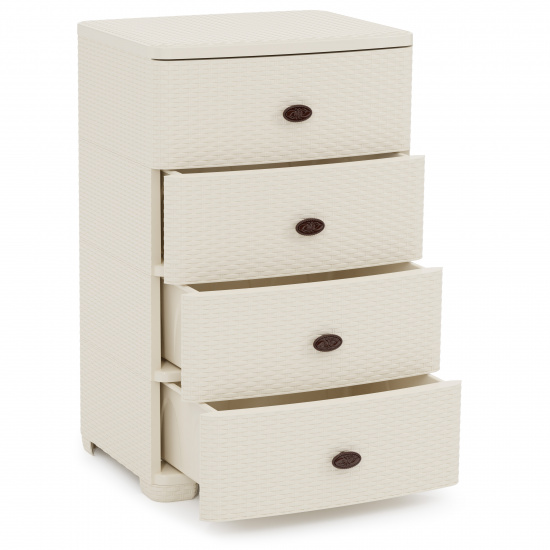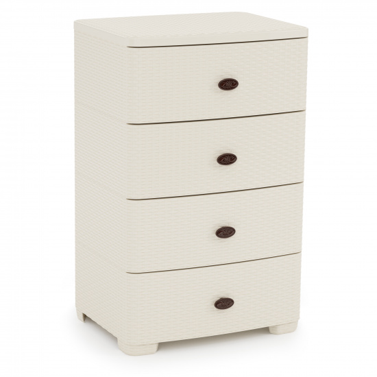 Оригинальный и функциональный комод заслужено пользуется большой популярностью среди наших покупателей. Изделие способно гармонично вписаться в интерьер любой комнаты. Комод произведен из высококачественного и безопасного полипропилена. При производстве используется только сертифицированное и экологически чистое, качественное сырье отечественных и зарубежных производителей. Данное изделие произведено на современном технологичном оборудовании, а потому отличается прочностью и устойчивостью разнообразным механическим воздействиям. Также особую прочность изделию придает цельная конструкция перегородок. Оригинальный внешний вид задает плетеная конструкция на поверхности лицевой части ящика. Комод имеет четыре широких выдвижных ящика большой вместимости, в которых будет очень удобно хранить личные вещи и другие принадлежности. Благодаря небольшому весу, комод очень легко передвигается.Комод упаковывается в индивидуальную упаковку, где каждый клиент сможет найти инструкцию по сборке.