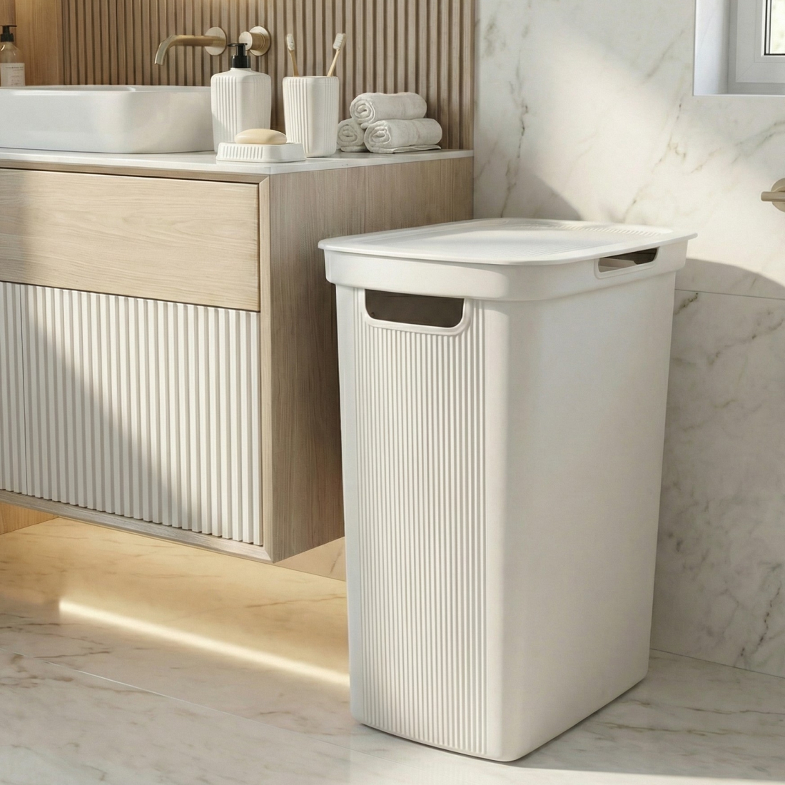 Корзина для белья «Лайн» - сочетание практичности, функциональности и элегантной простоты. Изделие выполнено в минималистичном дизайне и нейтральной цветовой гамме, что дает возможность вписать аксессуар в различные интерьерные решения. А матовая поверхность с эффектом soft-touch создает приятные тактильный и визуальный эффекты.