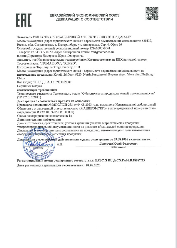 Клеенка PRIMA DIVA на тканой основе состоит из двух слоев: верхний слой – ПВХ, на котором нанесен рисунок, нижний слой – тканая основа из полиэстера.