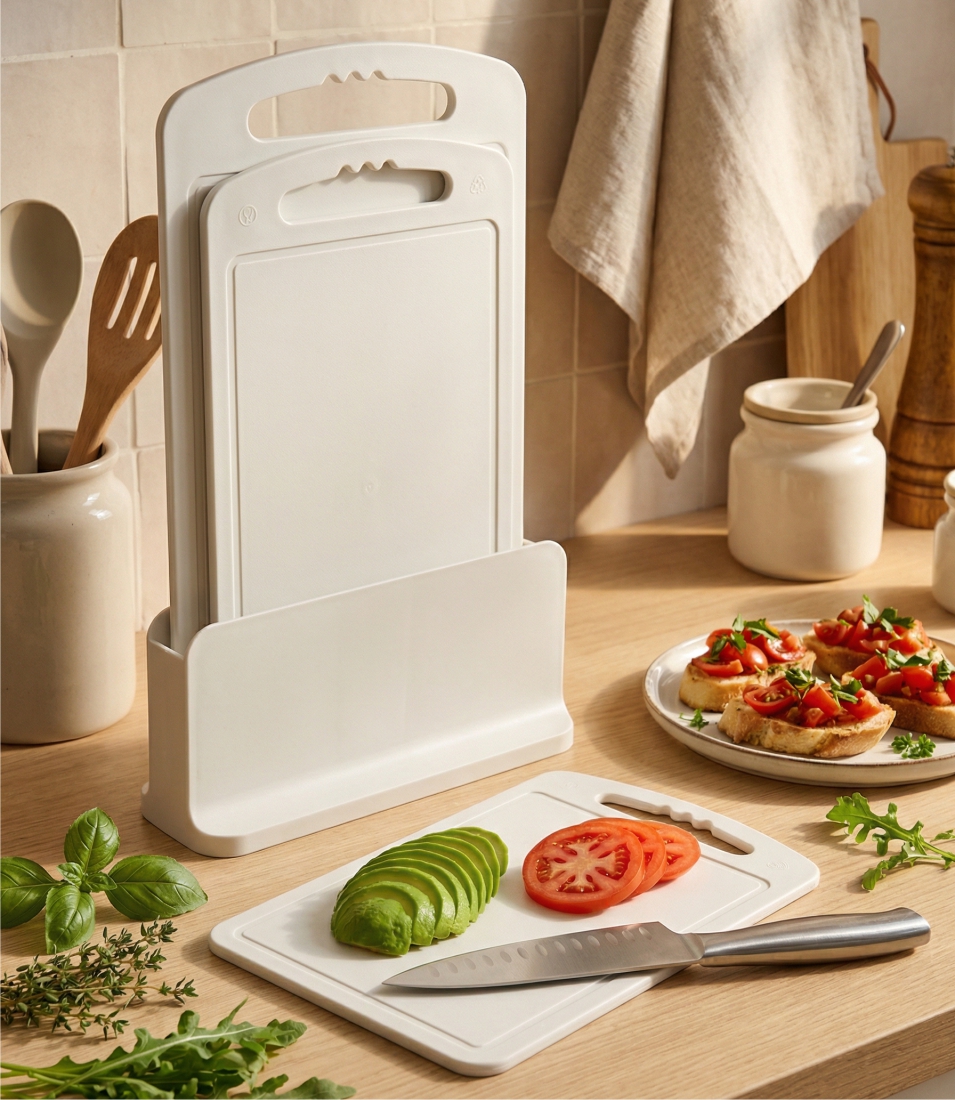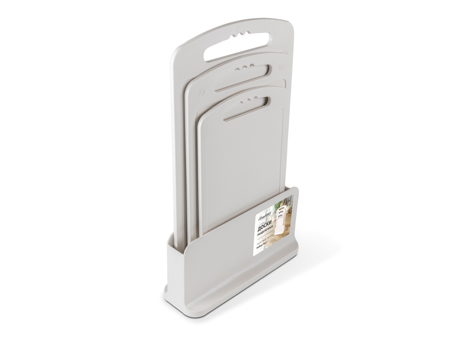 Набор состоит из трех разноразмерных классических досок 20х32см, 18х28см, 20х32см для различных видов продуктов. Специальная конструкция подставки с вентиляционными отверстиями на дне позволяет надежно удерживать доски, давая им хорошо просохнуть. Благодаря компактным размерам кухонный аксессуар не занимает много места на столешнице. Набор выполнен в нейтральном «молочном» оттенке, который создает мягкий визуальный эффект и делает пространство более спокойным и гармоничным. Можно мыть в посудомоечной машине на средних или низких температурных режимах.