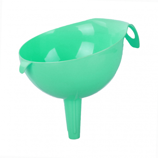 Воронка – важный предмет на любой кухне. Она облегчает процесс переливания различных жидкостей в ёмкости с более узким горлышком. На трубке имеются выступы для легкого выхода воздуха, вытесняемого при наполнении сосуда жидкостью. Воронку удобно держать и перемещать за выступающую ручку.