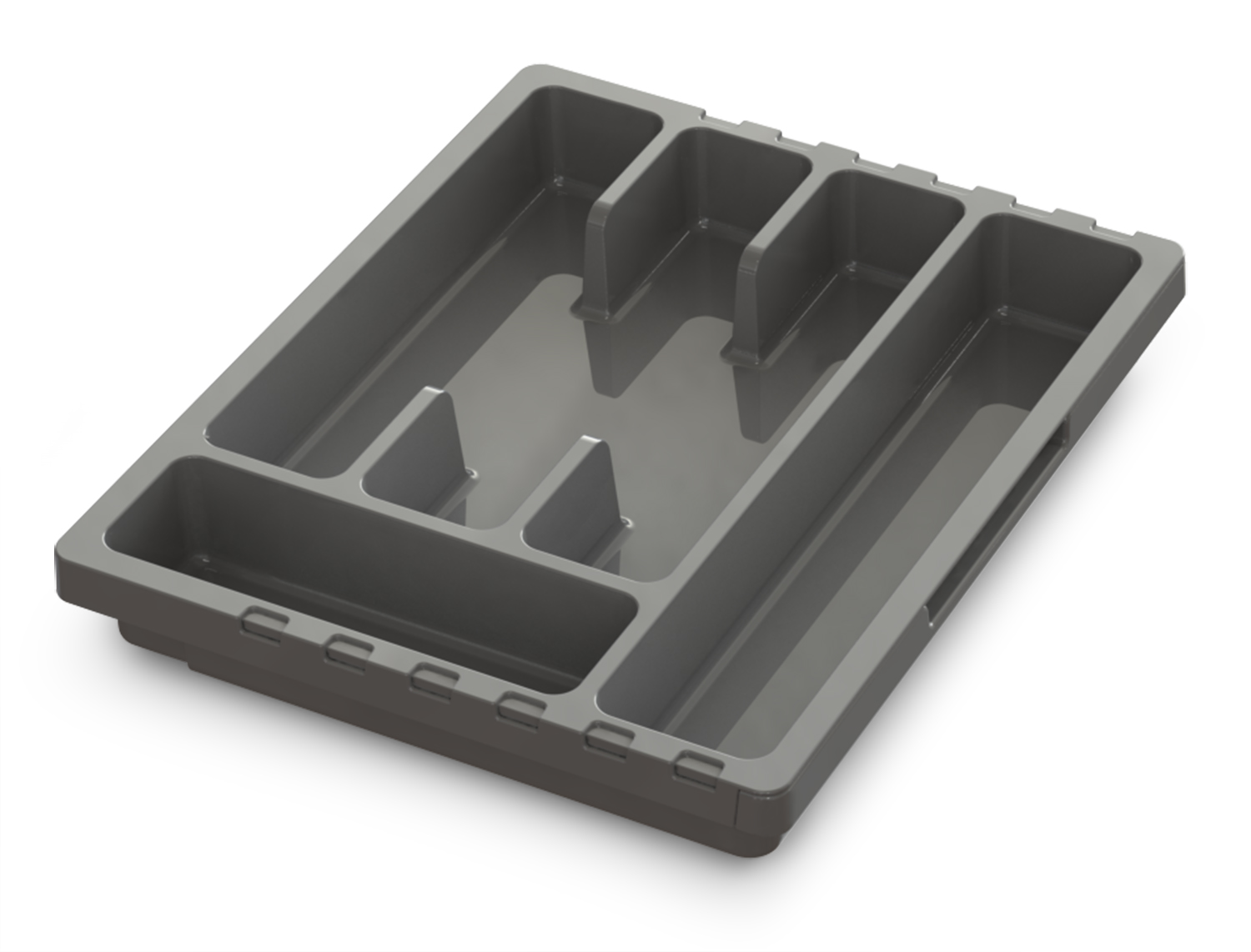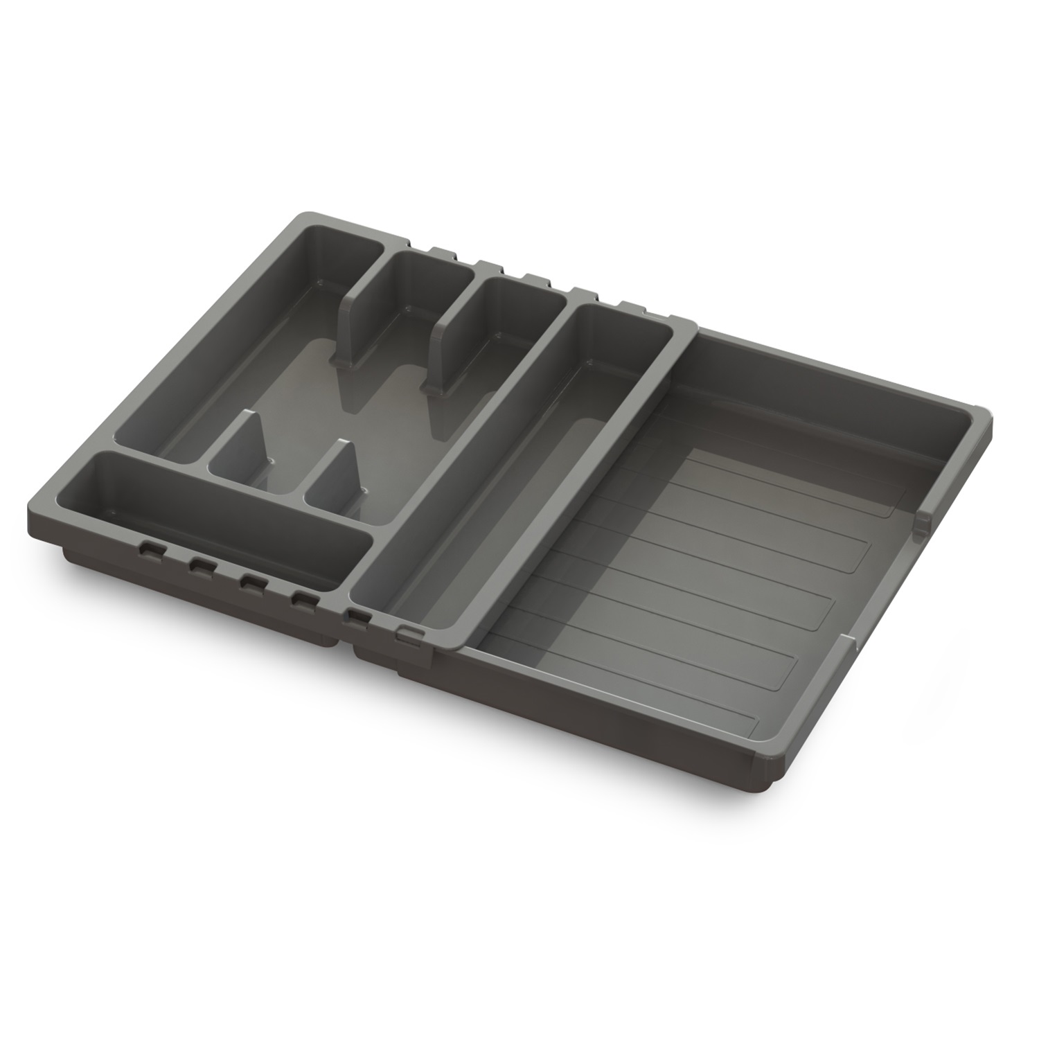Универсальный раздвижной лоток СМАРТ для столовых приборов подойдет под разные размеры выдвижных кухонных ящиков. Ширина лотка регулируется от 30 см до 50 см. Пять основных ячеек разного размера и одно выдвижное отделение позволят удобно расположить столовые приборы, разделив их по назначению, что сократит время на поиск нужного предмета. Лоток выполнен из износостойкого пищевого пластика, устойчивого к царапинам. Материал не боится влаги, не впитывает запахи и прост в уходе - лоток можно мыть в посудомоечной машине.