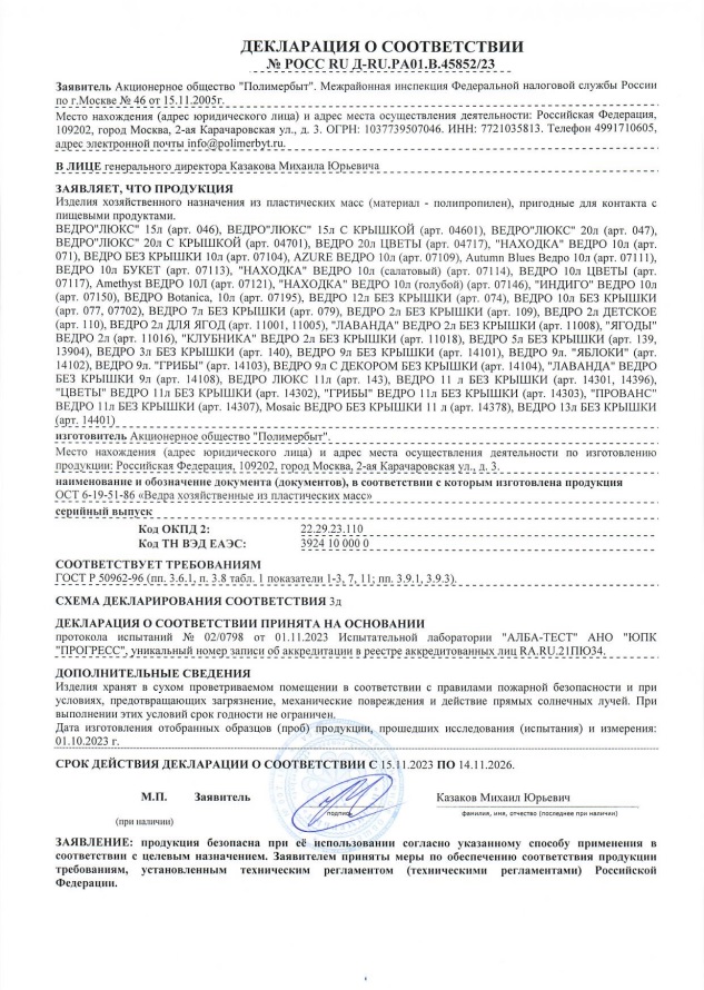 Ведро предназначено для бытового использования. Оно идеально послужит для хранения продуктов, уборки или в качестве мусорного ведра. Пластик безопасен и прочен. Ведро рассчитано на долгий срок службы.
