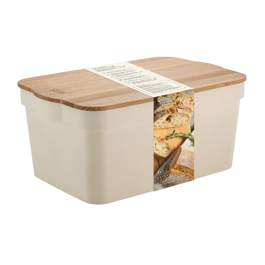 Хлебница Sugar&Spice Rosemary удобна и практична в использовании благодаря легкому корпусу и крышке 3в1. Трендовая форма хлебницы и деревянная крышка идеально дополнят интерьер Вашей кухни. Крышка изготовлена из дерева породы бук, обратную сторону можно использовать для нарезки хлебобулочных изделий, лицевую - для подачи закусок. Объём 7,5л позволяет хранить хлебобулочные изделия для всей семьи, при этом хлебница не занимает много места. Крышка плотно прилегает к корпусу, тем самым хлеб всегда остается свежим и вкусным. Хлебницей приятно пользоваться засчёт soft-touch покрытия корпуса. Удобно взять с собой на природу. Корпус можно мыть в посудомоечной машине, разогревать в микроволновой печи с приоткрытой крышкой и хранить в холодильнике. Крышка обработана гипоаллергенным маслом, что надежно защищает ее от влаги и сохраняет естественный цвет дерева, снижается риск проникновения запахов внутрь текстуры древесины. Для сохранения качества дерева: крышку не рекомендуется мыть в посудомоечной машине, разогревать в микроволновой печи и замачивать на длительное время в воде, избегать перепадов температуры. Крышку необходимо мыть тёплой водой с мыльным раствором, после мытья тщательно просушить; каждые 2-3 месяца покрывать пищевым маслом.