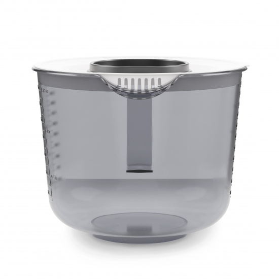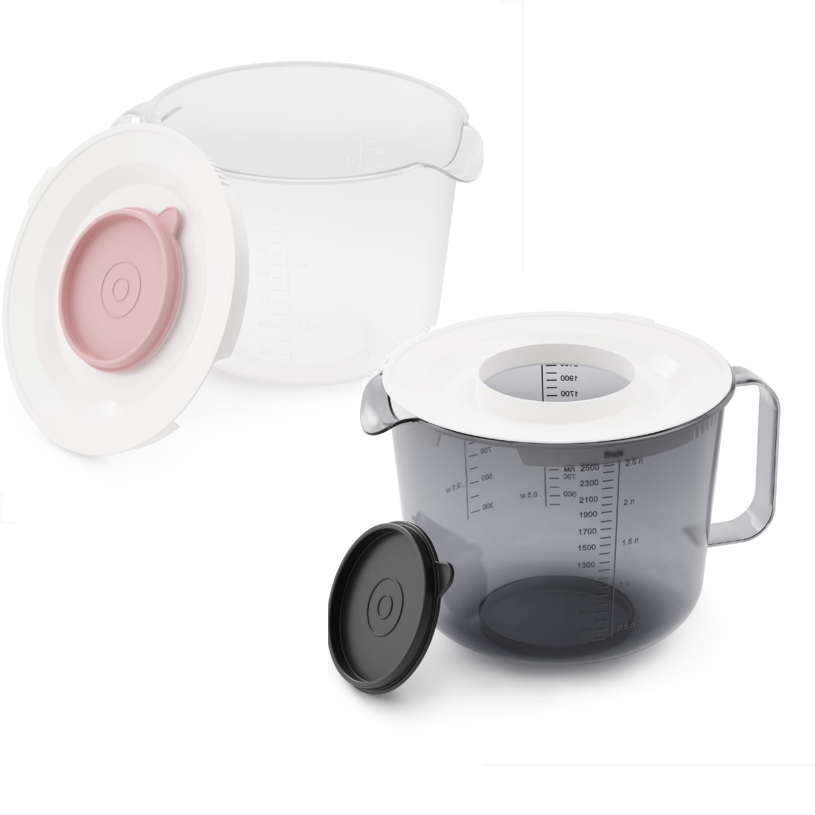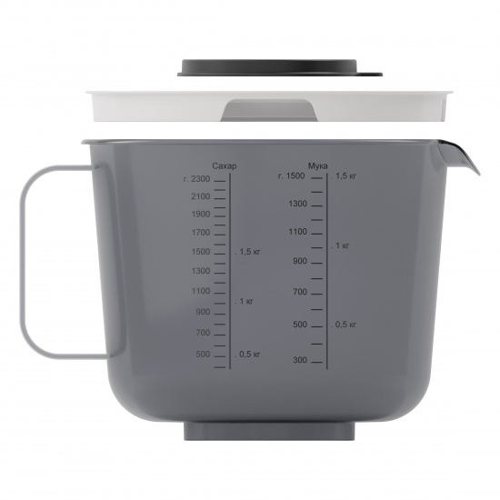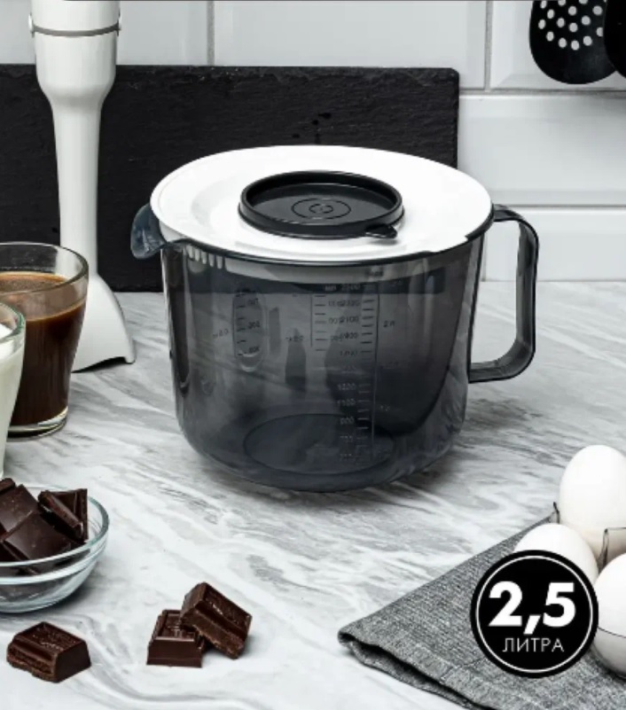 Перед Вами идеальный помощник на любой кухне. Ёмкость предназначена для приготовления теста, кремов, коктейлей, фруктово-ягодных муссов и других блюд. Взбивание продуктов можно осуществлять как миксером, так и блендером. Процесс приготовления становится комфортным благодаря специальной крышке, защищающей от разбрызгивания. В ёмкости легко хранить уже готовые коктейли, достаточно лишь закрыть отверстие дополнительной мягкой крышкой, защищающей продукты от заветривания. Эта центральная крышка, надетая во время работы миксера на дно, дарит ёмкости противоскользящий эффект. Для удобного слива содержимого на ёмкости имеется эргономичная ручка и носик. Мерная шкала даёт возможность использования изделия и в качестве мерного стакана.