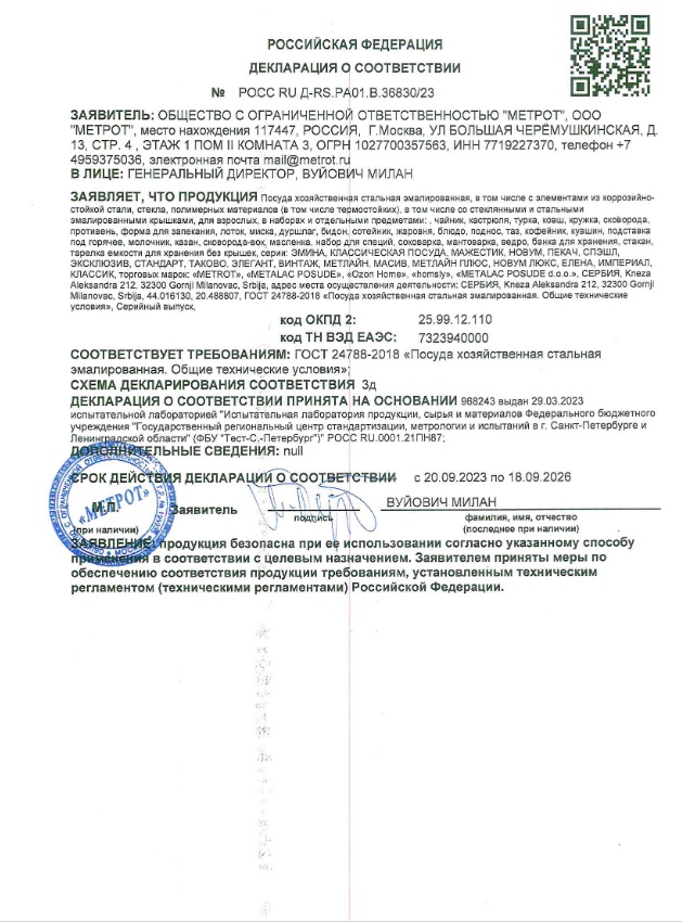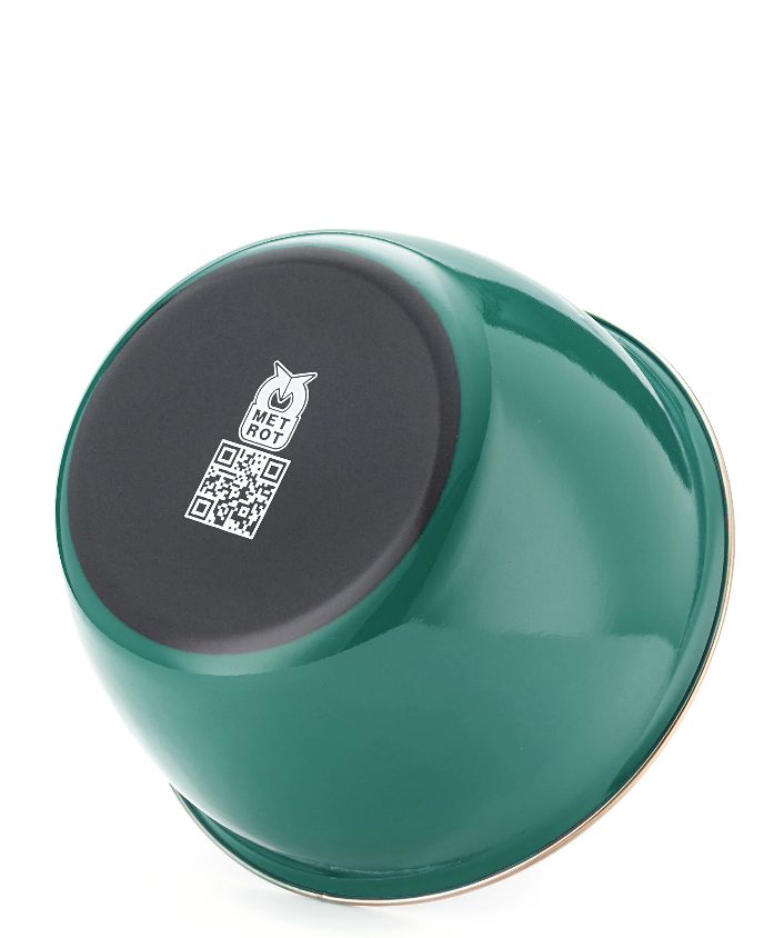 "Посуда METROT изготовлена из стали с 3-х слойным эмалированным покрытием с обеих сторон. Эмалевое покрытие, являясь стекольной массой, не вступает во взаимодействие с продуктами питания, не искажает их вкус, надежно защищает пищу от контакта с металлом и не вызывает аллергию. Подходит для приготовления и хранения любых блюд, включая диетические. Металлическая крышка ускоряет процесс приготовления блюд. Фурнитура из термостойкого материала - бакелита - делает взаимодействие безопасным. Подходит для ВСЕХ типов плит и мытья в посудомоечной машине. Долговечна и неприхотлива в уходе.