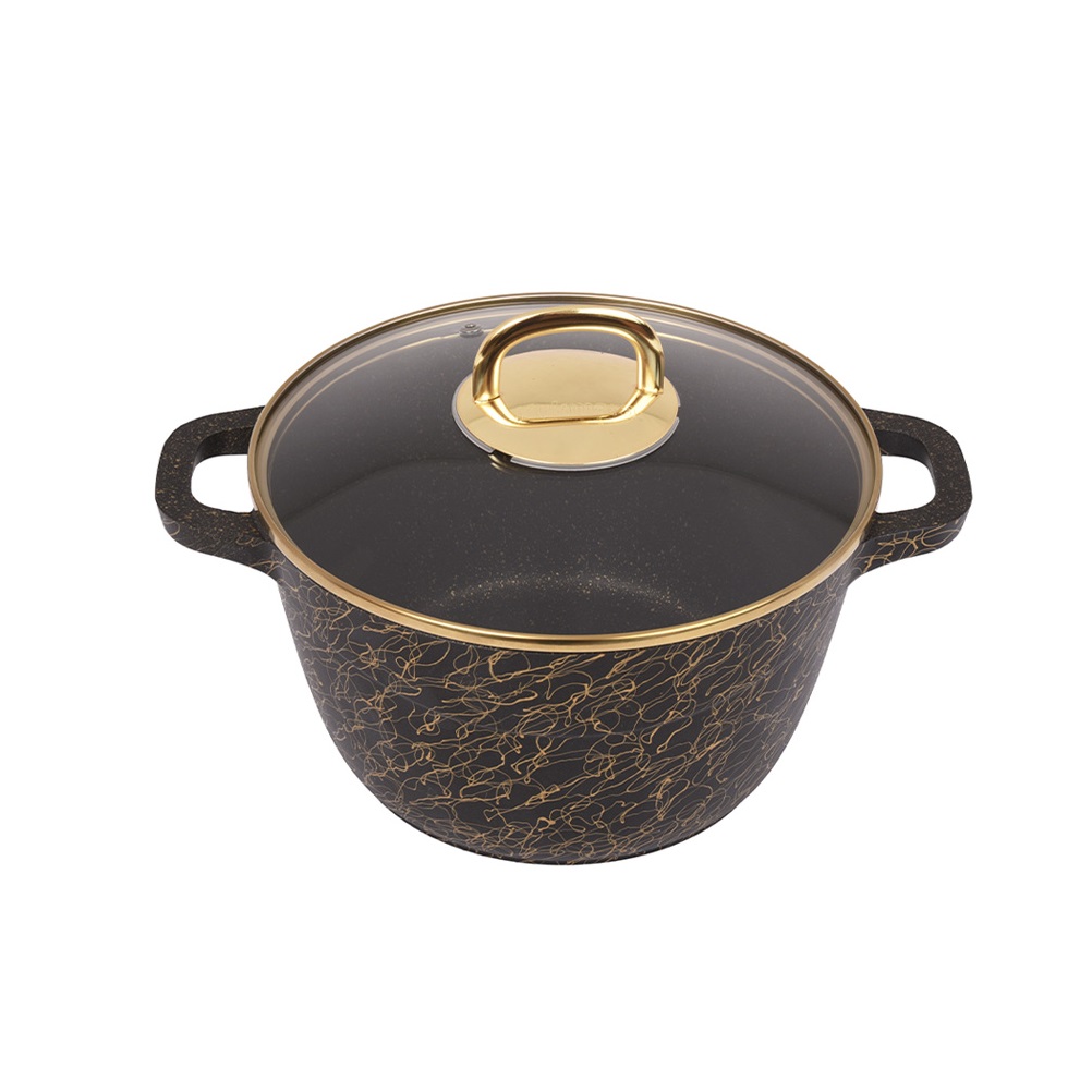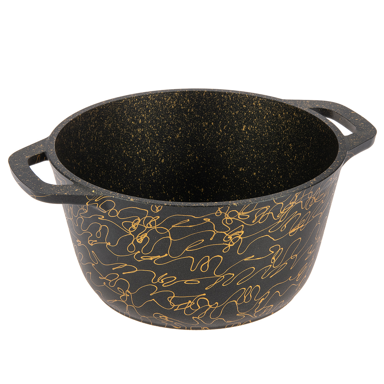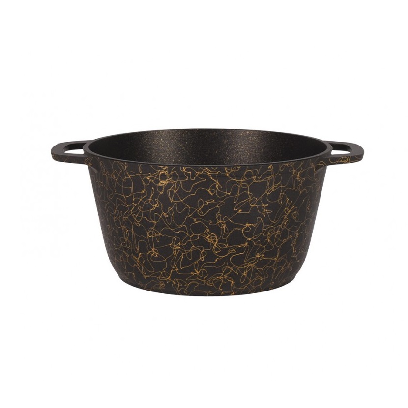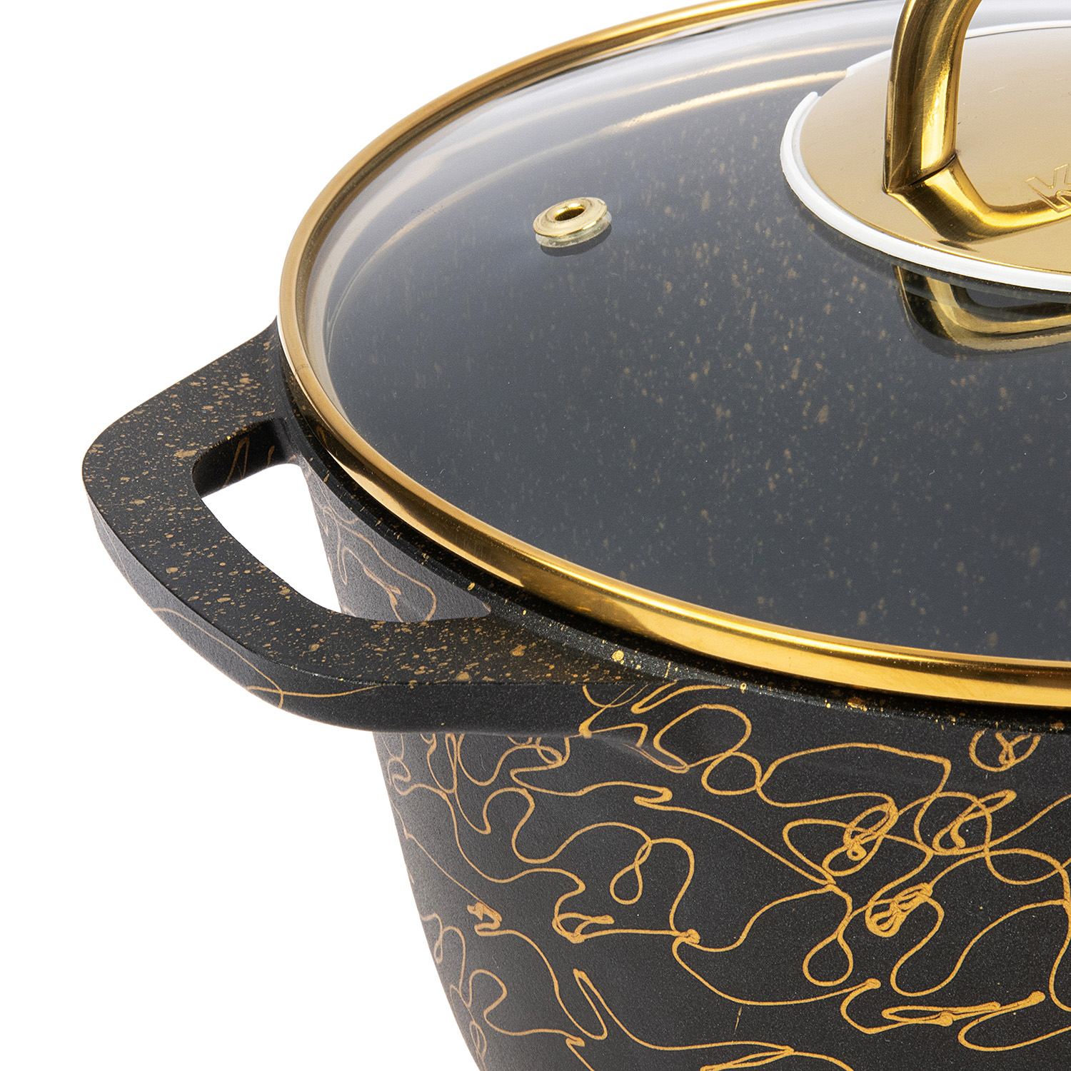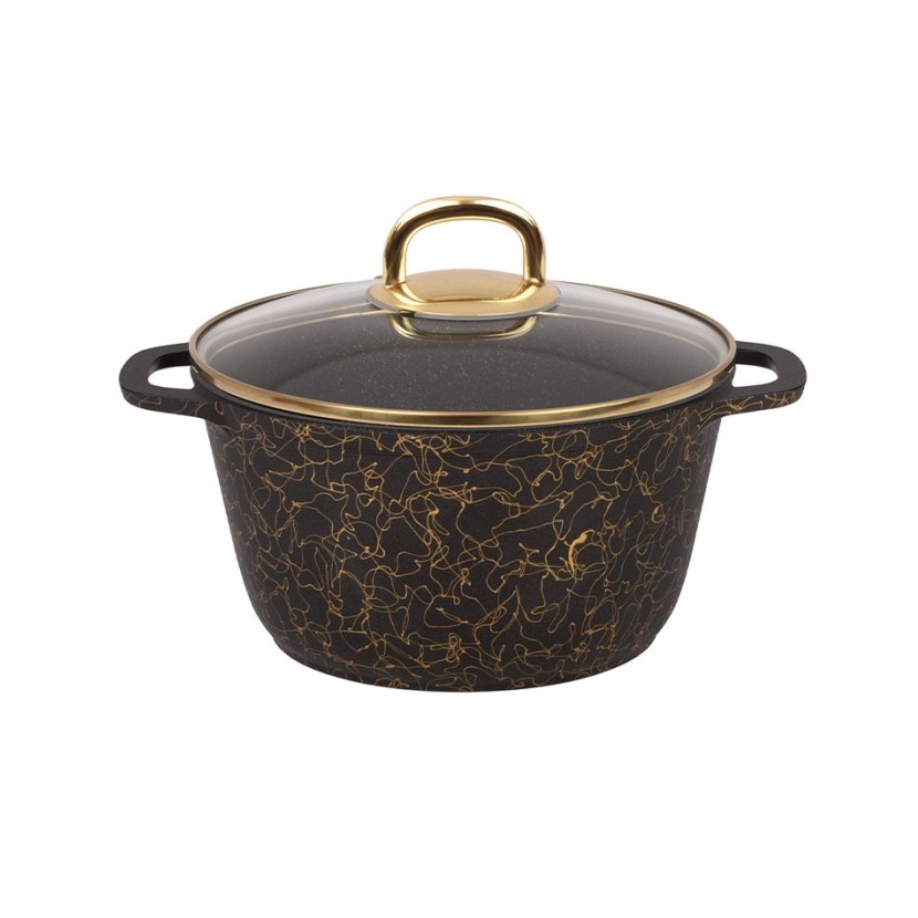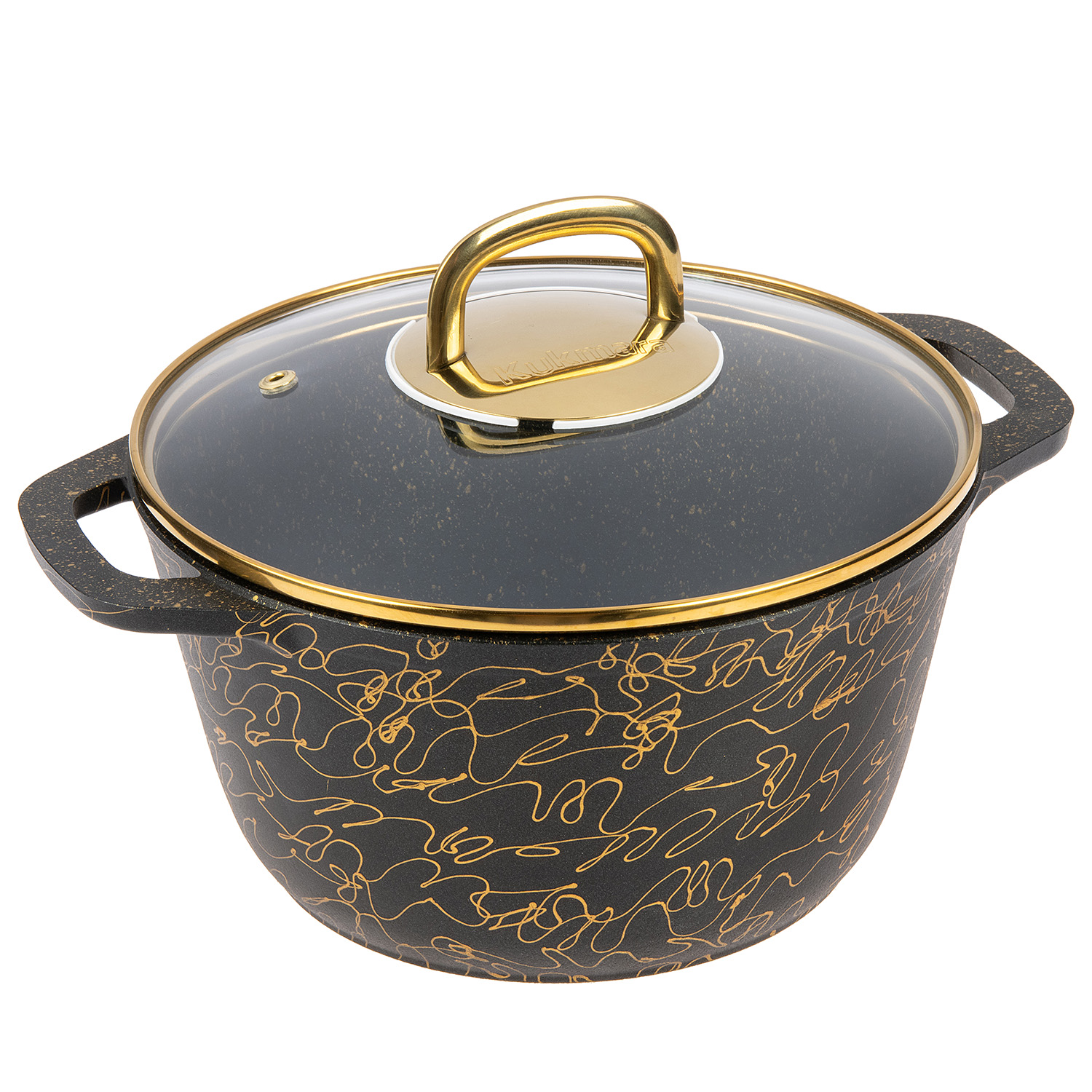 Оригинальная отделка внешней поверхности с помощью золотых и серебряных нитей, а так же уникальное внутреннее противопригорающее покрытие, обладающее исключительными антипригарными свойствами, прочностью и износостойкостью, не содержит PFOA, кадмий, свинец и полностью безопасно. Высокая прочность антипригарного покрытия позволяет использовать неострые кухонные металлические принадлежности.Стеклянную крышку не рекомендуется использовать в духовом шкафу из-за возможного потемнения покрытия под золото.