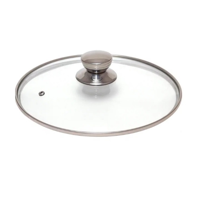 Классическая стеклянная крышка для посуды с ободом и ручкой из нержавеющей стали. Не нагревается на варочных поверхностях, выдерживает температуру до 230 градусов.