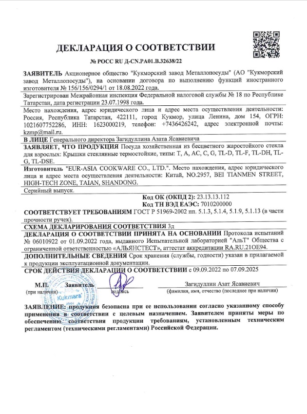 Крышка изготовлена из термостойкого и экологичного стекла. Изделие соответствует требованиям ГОСТ Р 51969-2002