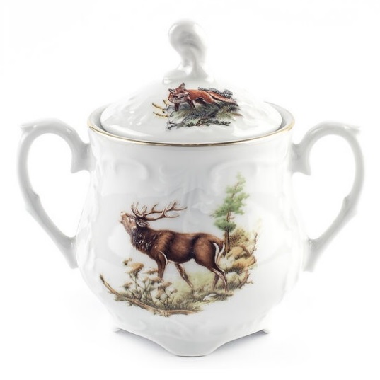 Сахарница CMIELOW Рококо. Отличительной особенностью является вечная элегантность, выраженная в плавных линиях и орнаментальных украшениях. На блюдце выполнен декор Охота.