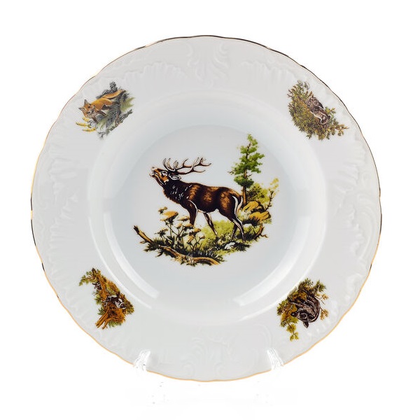 Отличительной особенностью является вечная элегантность, выраженная в плавных линиях и орнаментальных украшениях. На блюдце выполнен декор Охота.