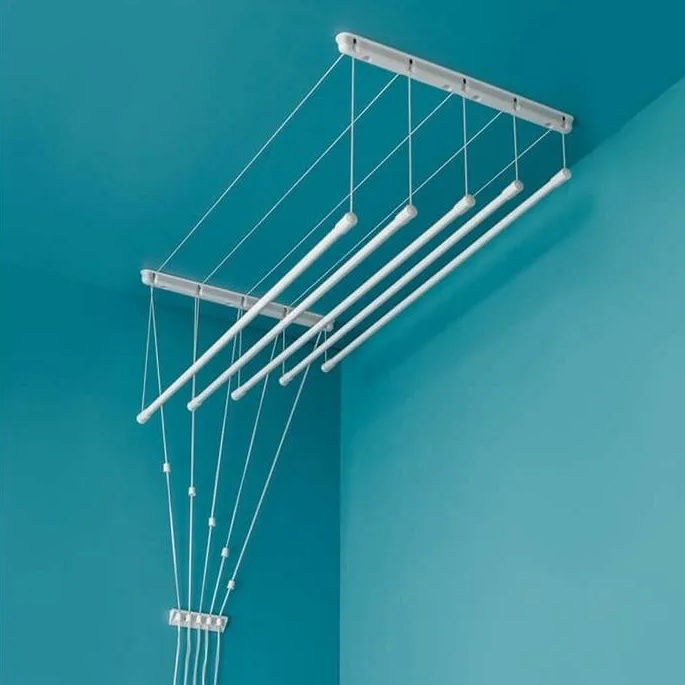 Сушилка для белья имеет универсальное крепление для установки как на стене, так и на потолке помещения ванной комнаты, либо на балконе. Сушилка оснащена подъемными стержнями, для которых можно установить комфортную высоту, что позволит максимально удобно развешивать и снимать белье.